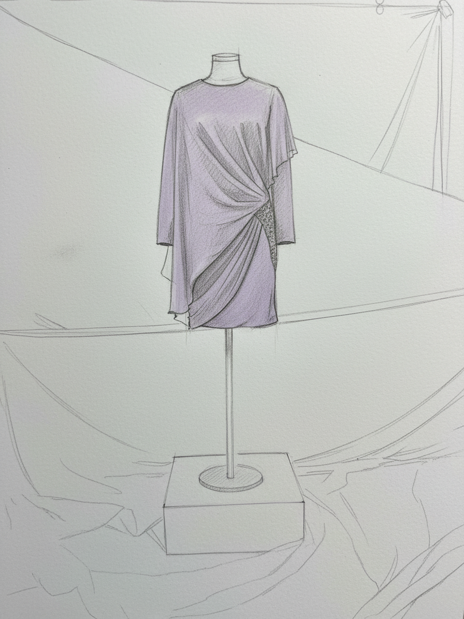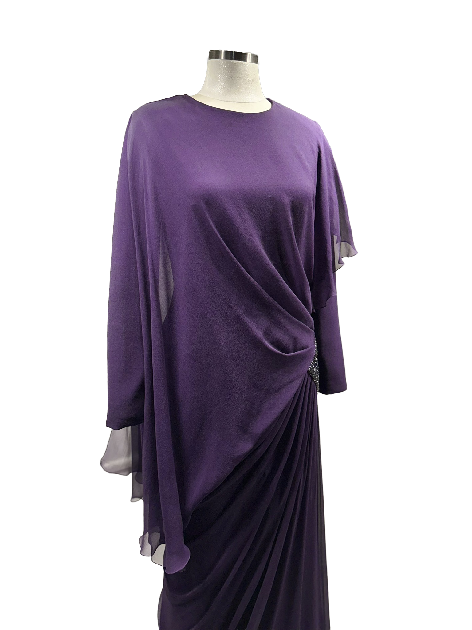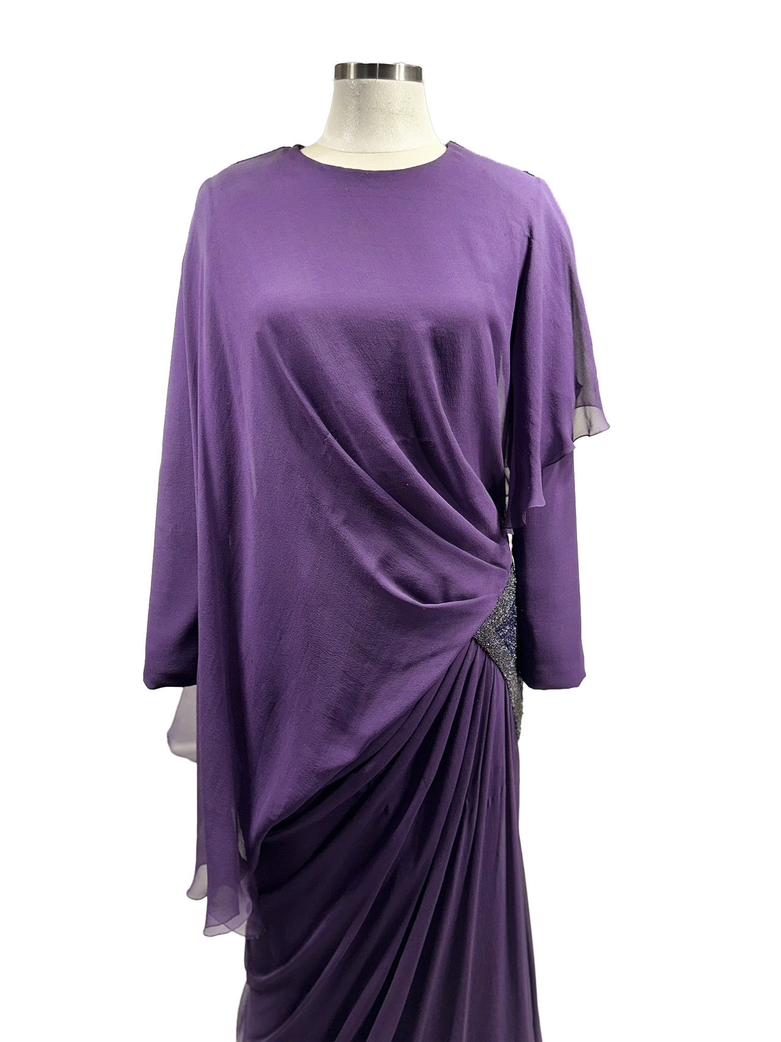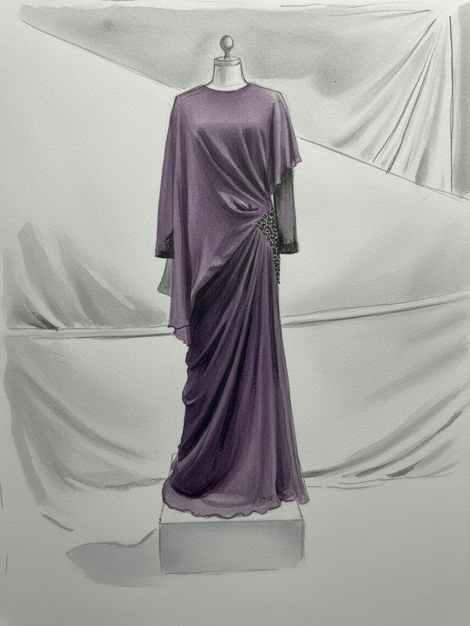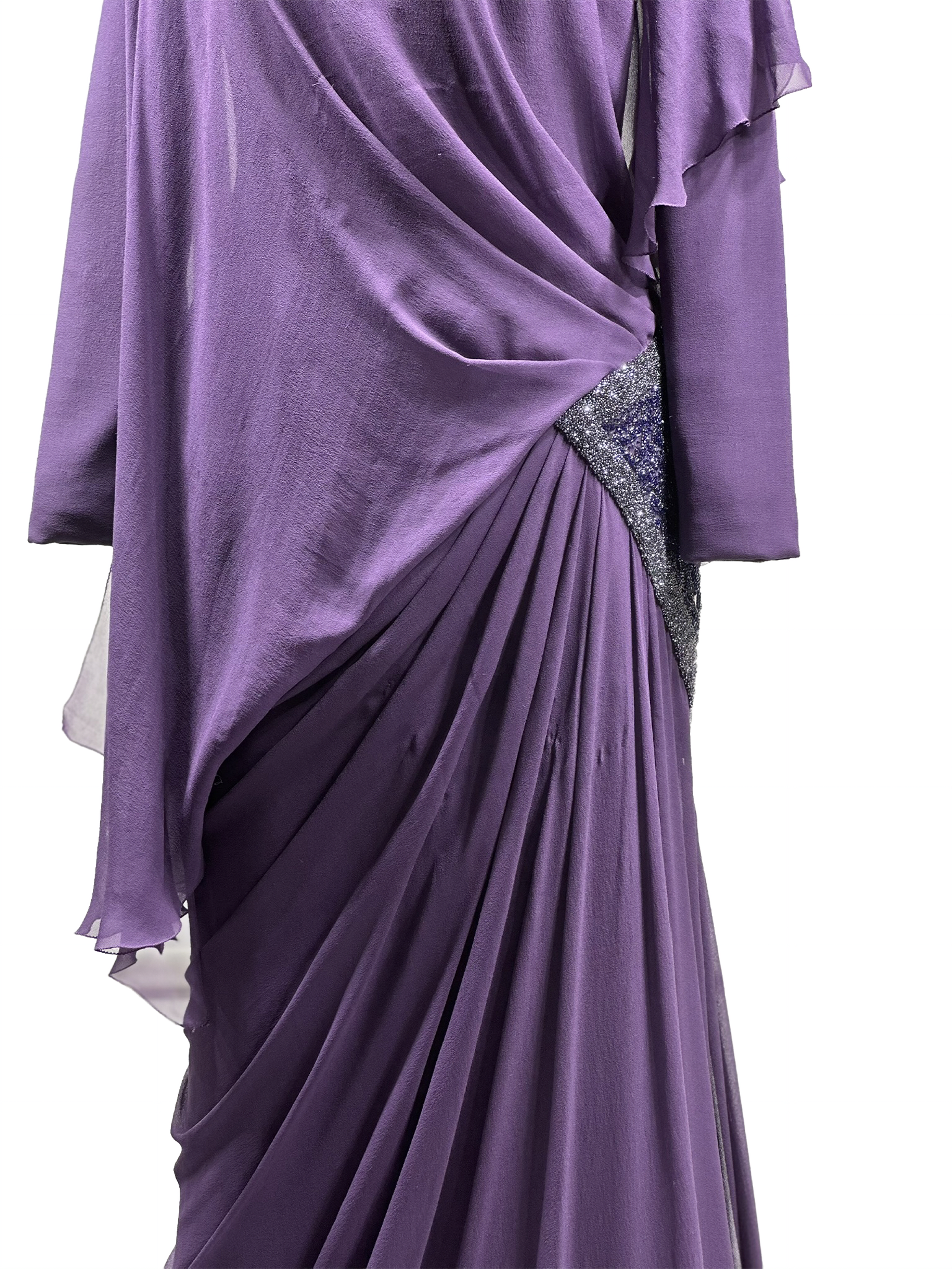 Derin mor tonların asaleti, yumuşak dökümlü şifon katmanlarla bedeni saran bir akışa dönüşüyor. Asimetrik drapeler hareketi vurgularken, bel hattında yer alan ışıltılı dokunuş tasarıma kontrollü bir ihtişam katıyor. Gücünü sadelikten alan bu siluet, zamansız bir zarafeti modern bir duruşla buluşturuyor.