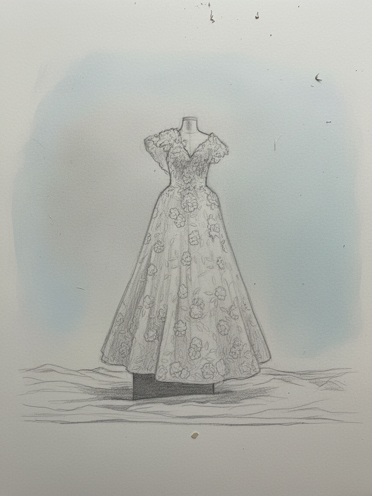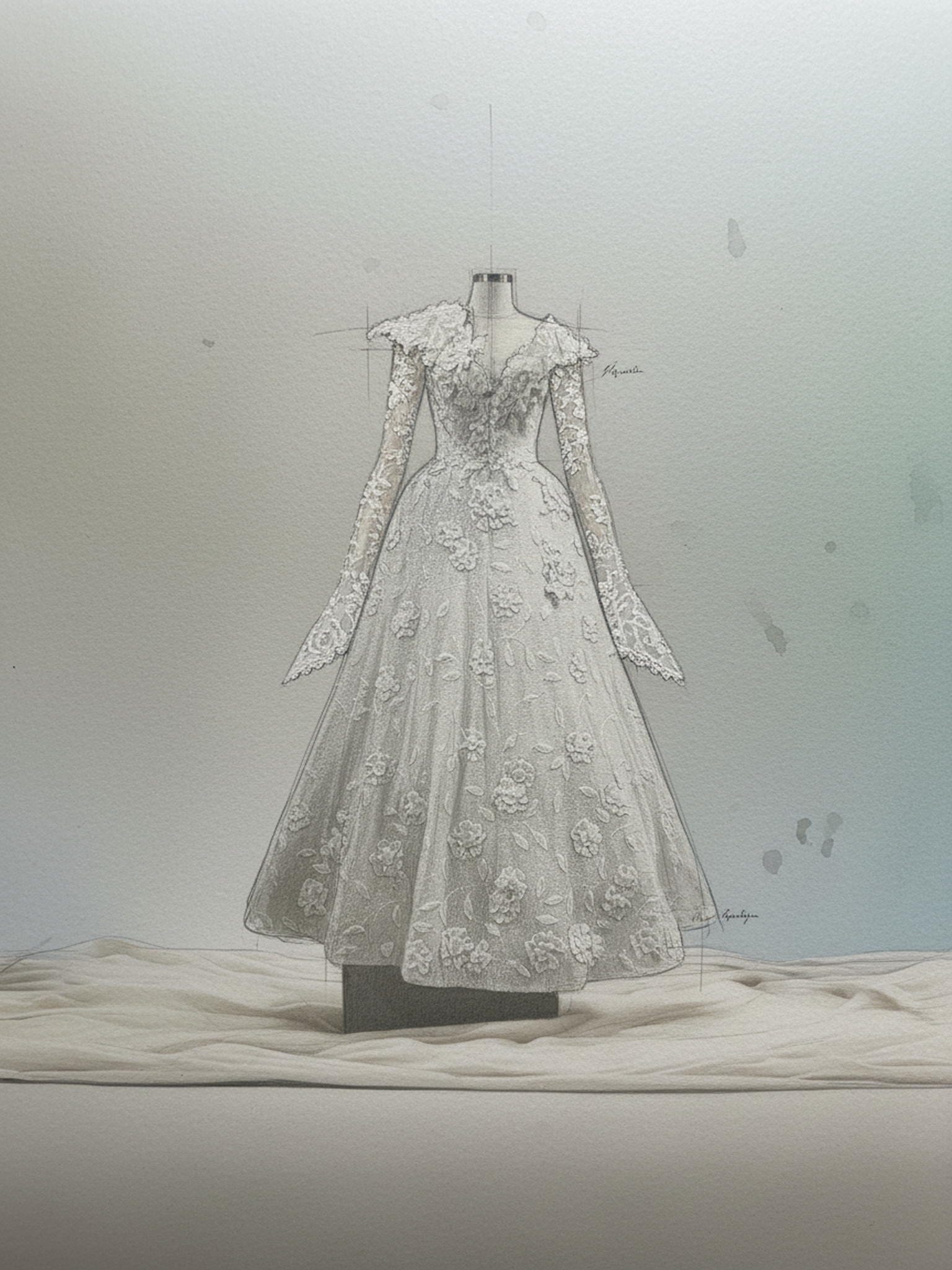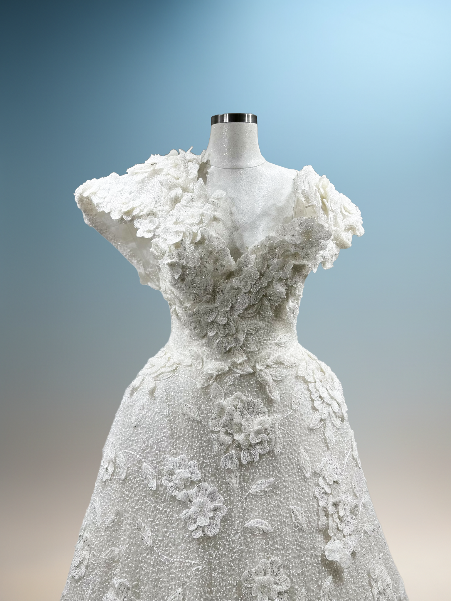 Hafif dokulu yüzeyi ve zarif çiçek aplikeleriyle bu siluet, romantik bir sadeliği çağdaş bir duruşla birleştirir. Yumuşak hacim ve dengeli form, zamansız bir couture zarafeti sunar.