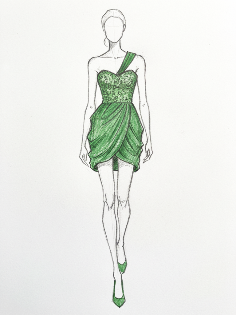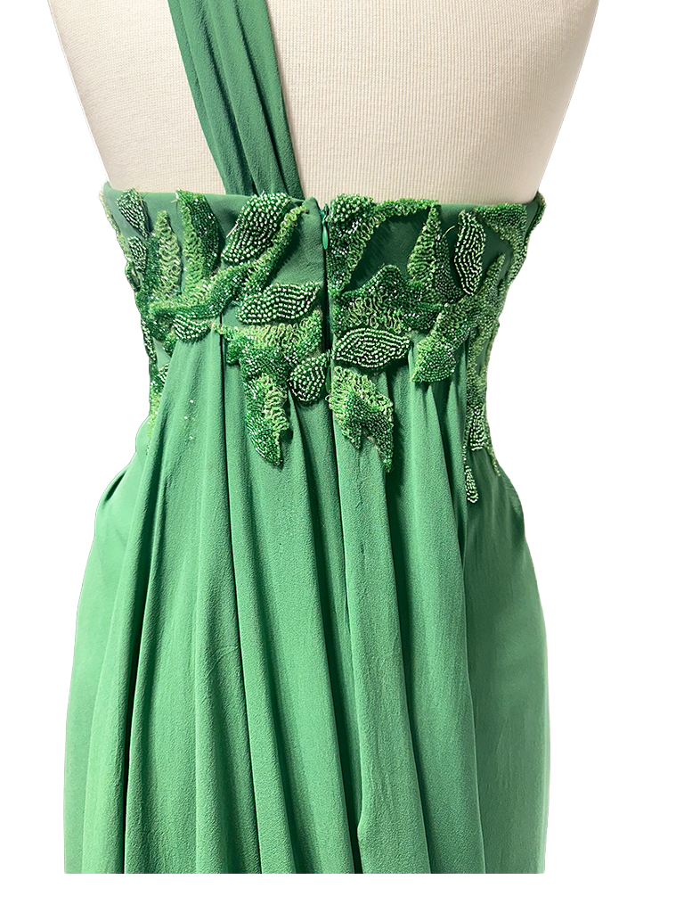 “Bu tasarımda yeşilin sakin gücünü öne çıkarmak istedim. Tek omuzdan geçen modern kesim, doğal bir akışı çağrıştırırken; gövdedeki çiçek işlemeleri ormanın kalbinde açan sessiz bir güzellik gibi elbiseye hayat veriyor. Yumuşak dökümlü etek, her adımda hafif bir rüzgârın nefesini taşır. Elbisenin ruhu: doğal zarafet ve sade ihtişam.”
