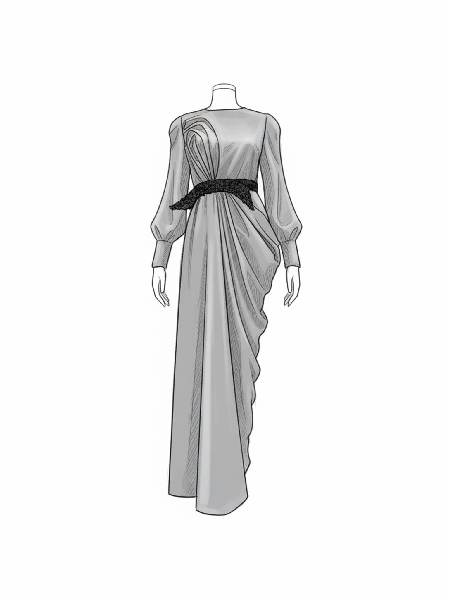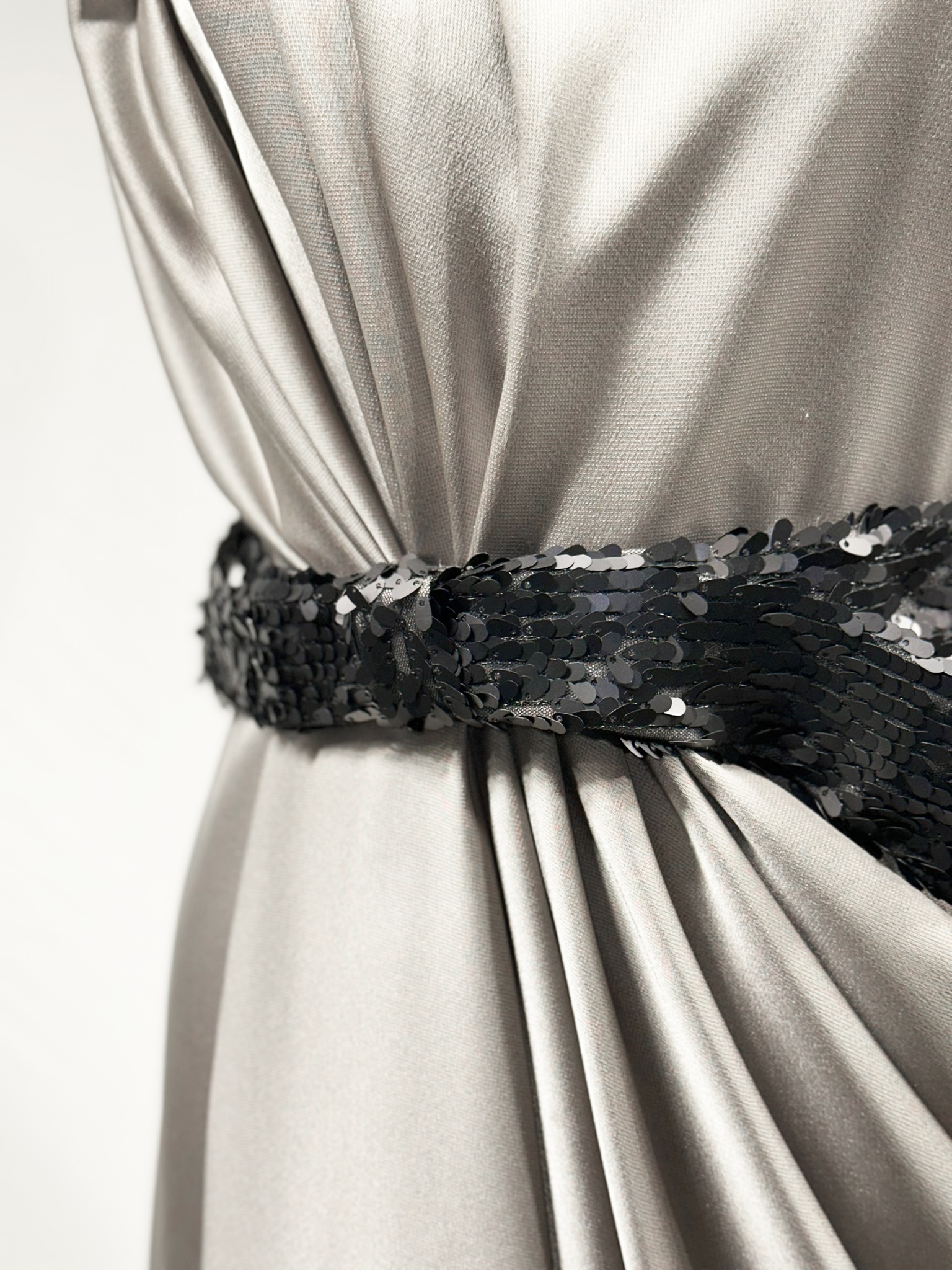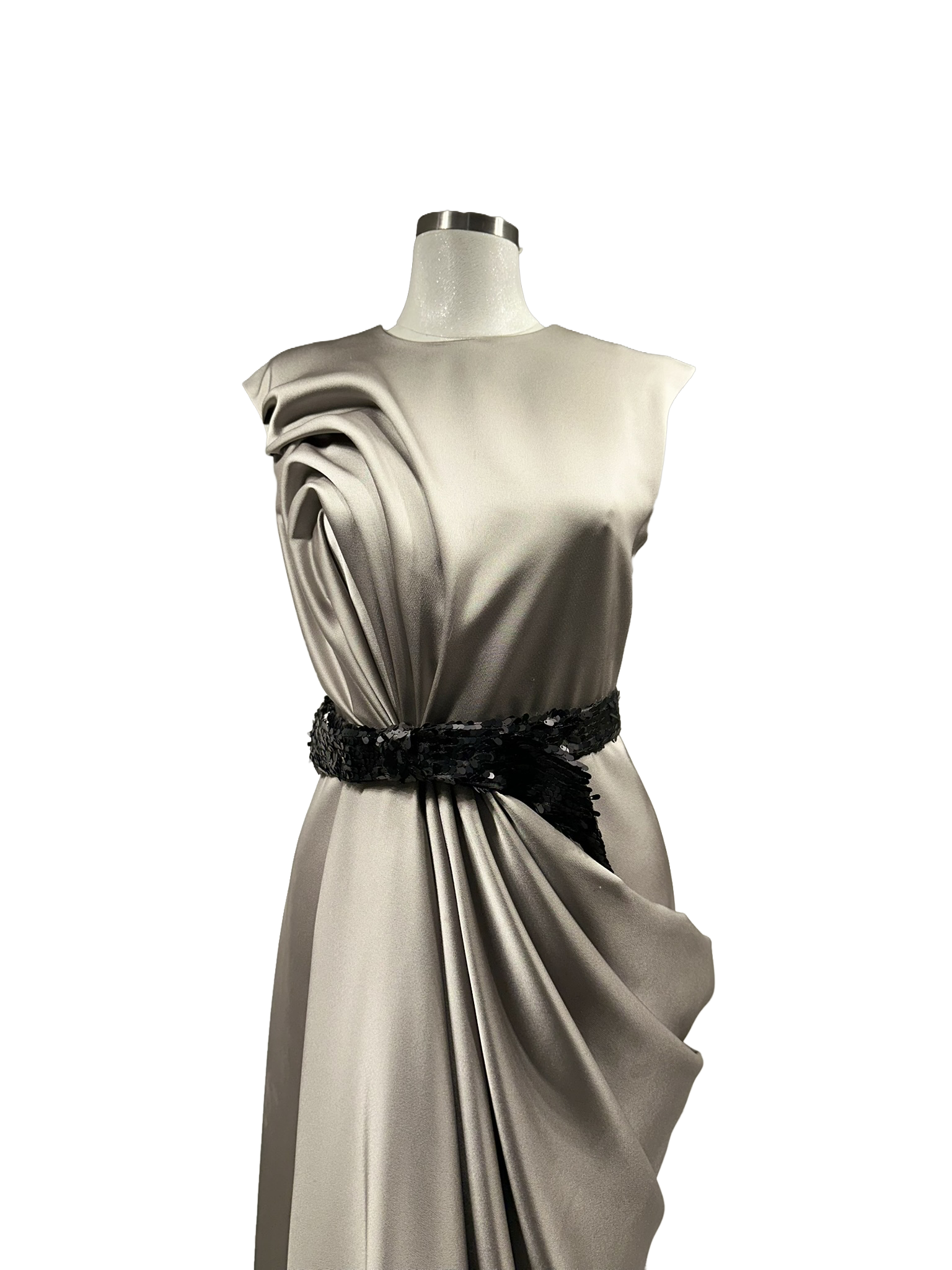 Akışkan saten, heykelsi drapelerle form kazanırken siyah payet kemer tasarıma güçlü bir kontrast ve modern bir vurgu katar. Zamansız, sade ve dengeli bir siluet hedeflendi.