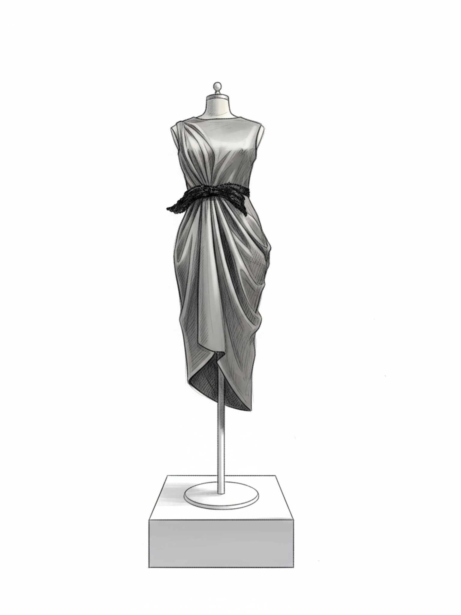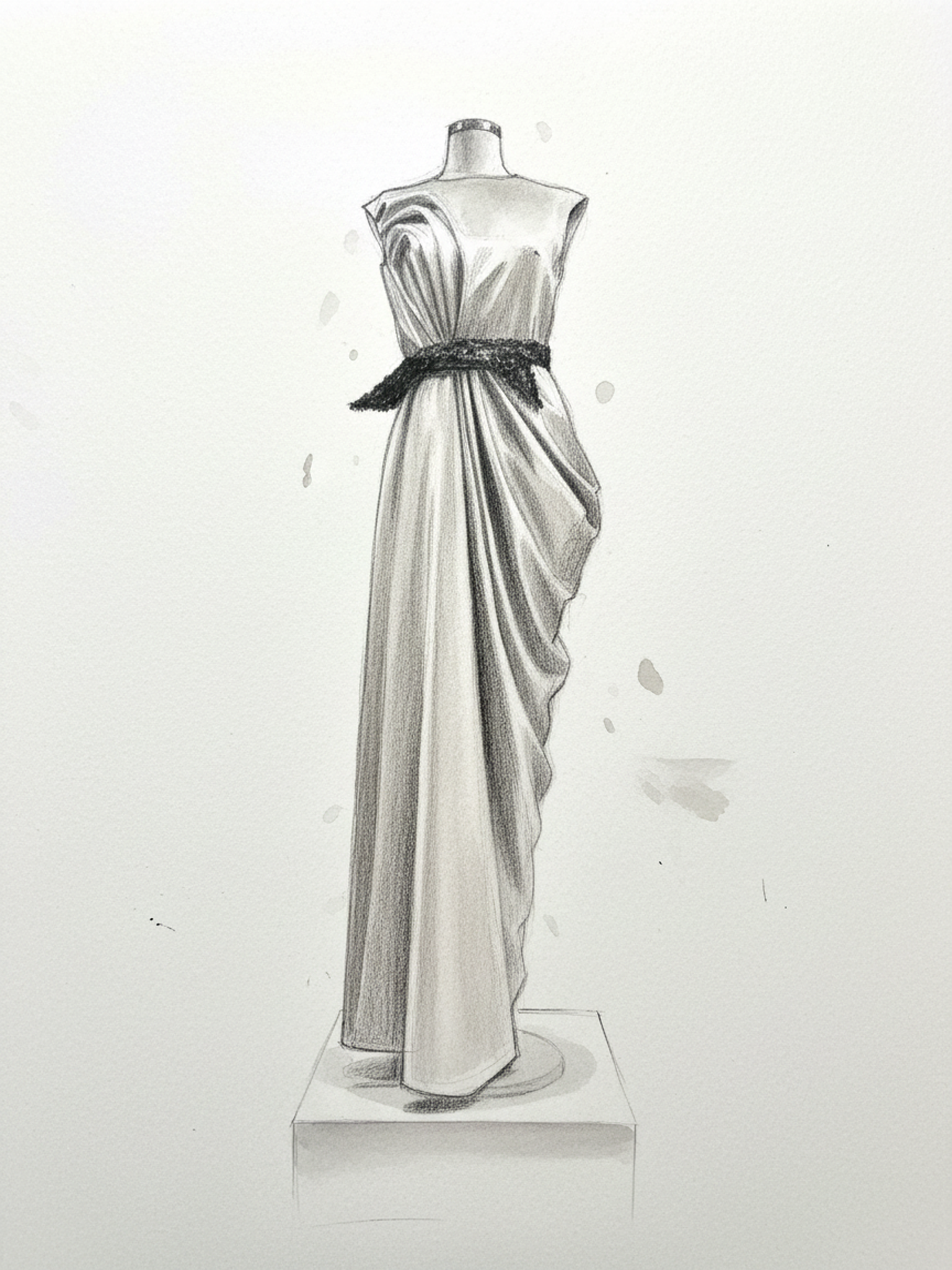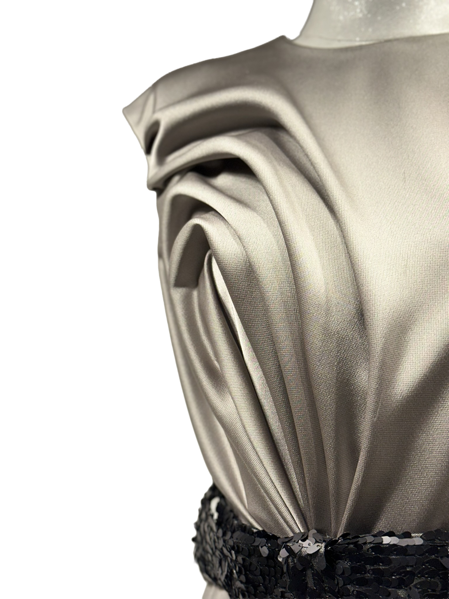Akışkan saten, heykelsi drapelerle form kazanırken siyah payet kemer tasarıma güçlü bir kontrast ve modern bir vurgu katar. Zamansız, sade ve dengeli bir siluet hedeflendi.