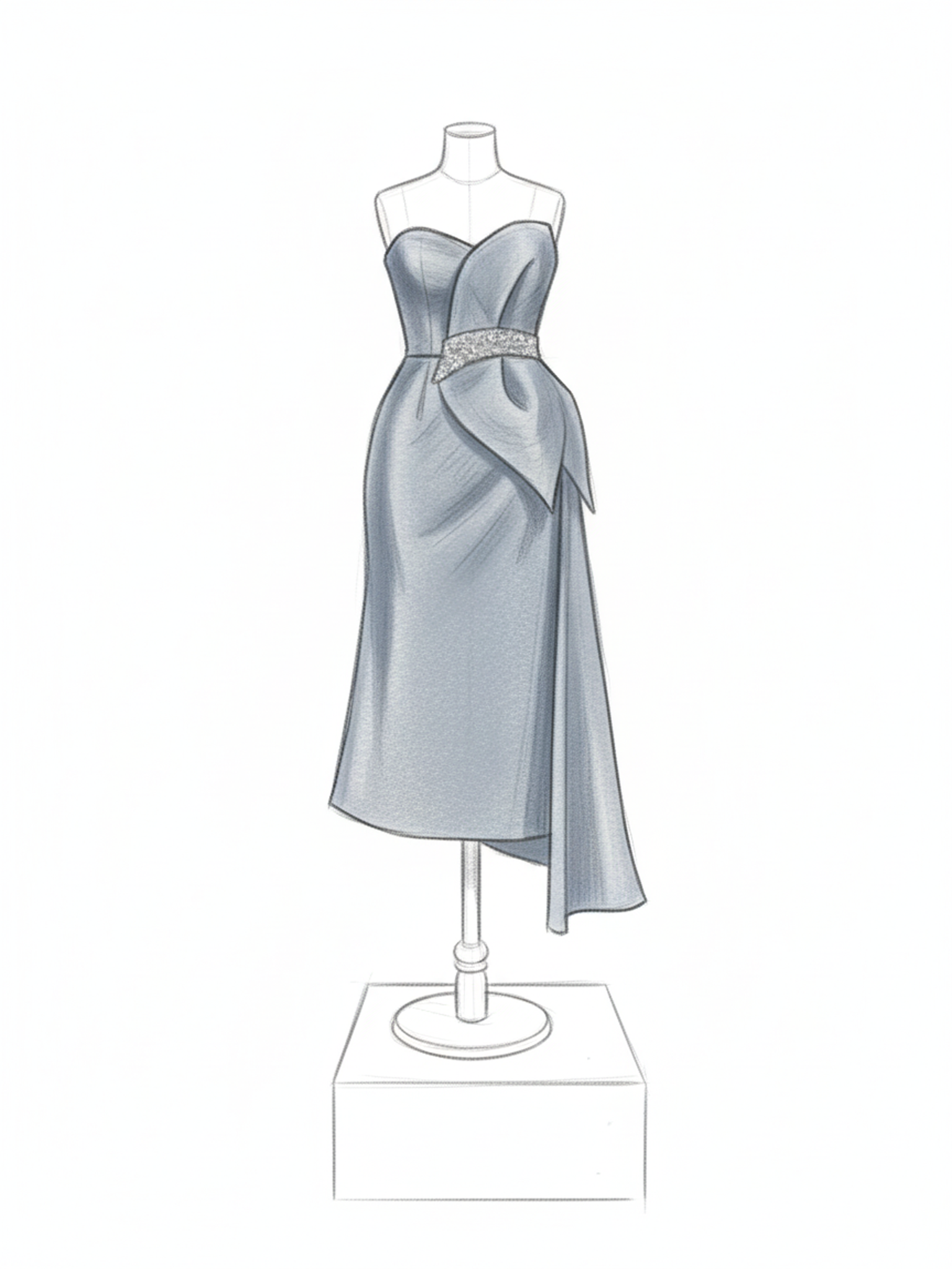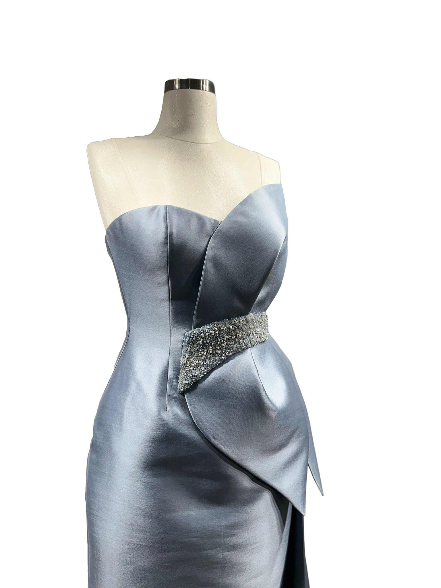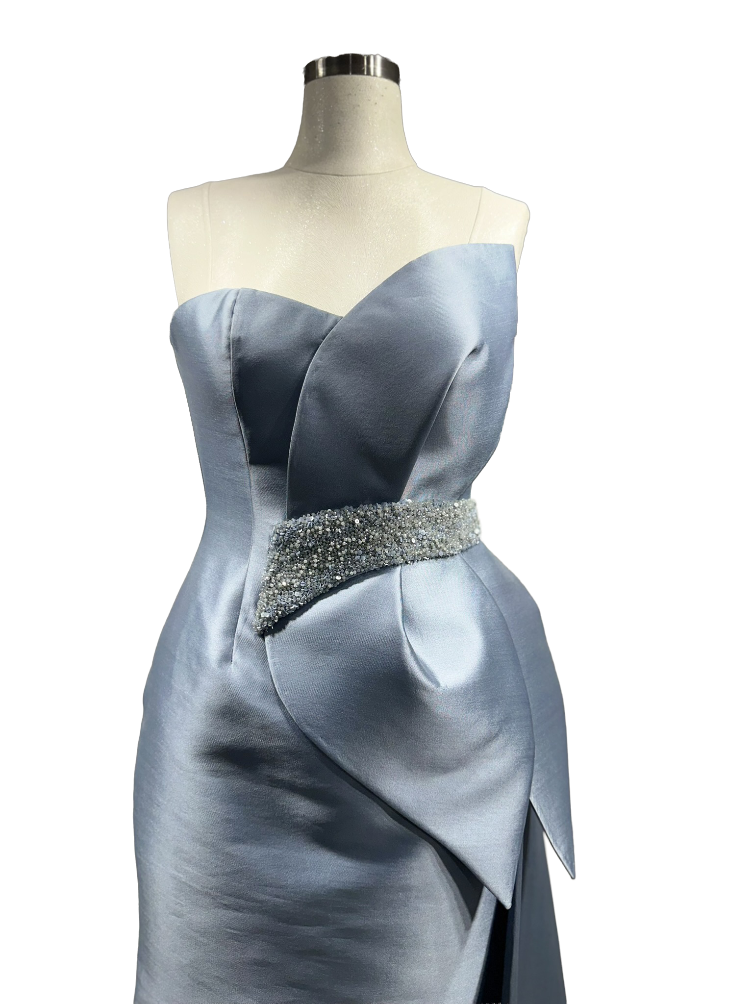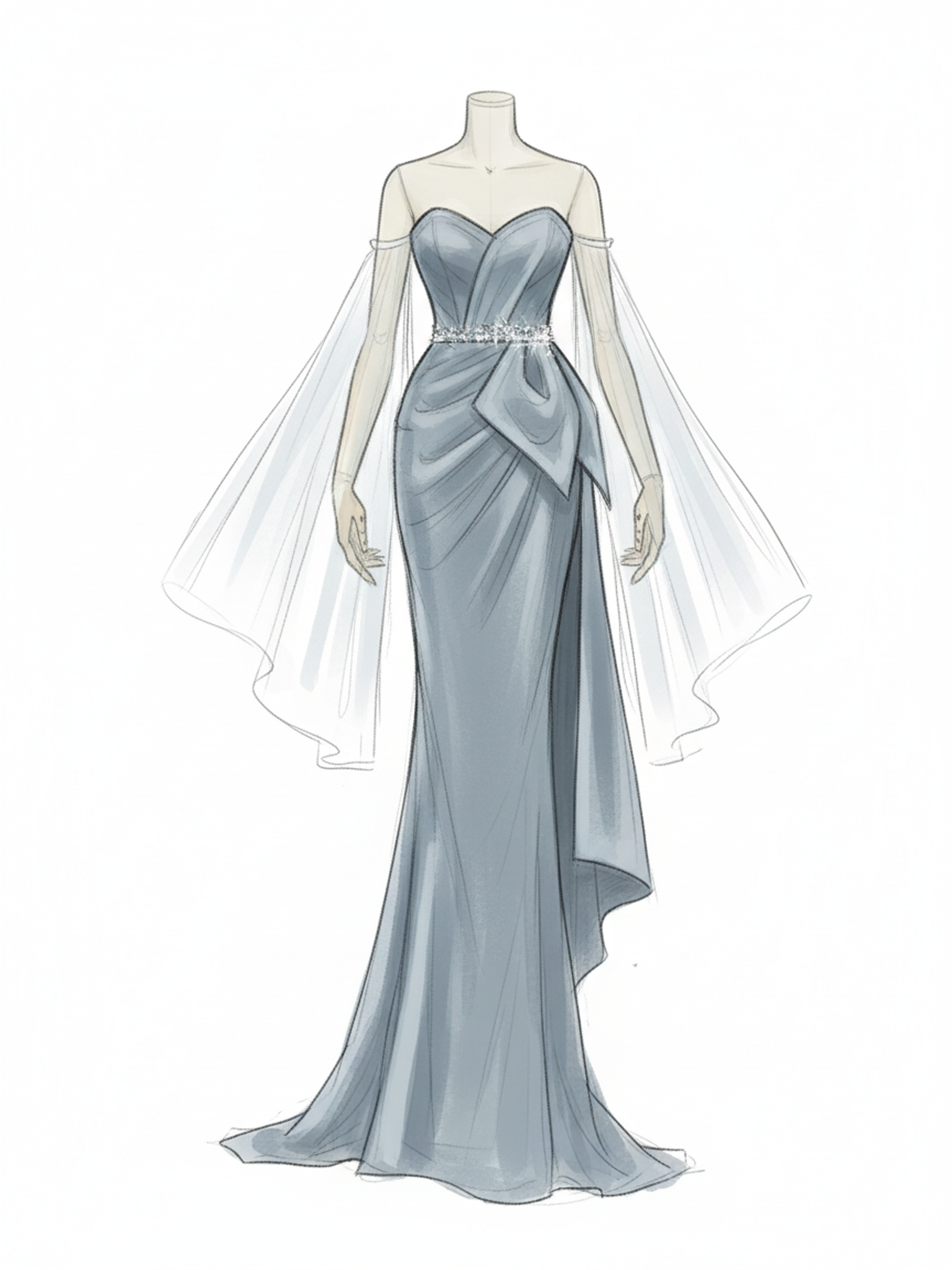 Altın işlemelerle vurgulanan tek omuz detayı, akışkan tül form üzerinde zamansız ve asil bir etki yaratır.