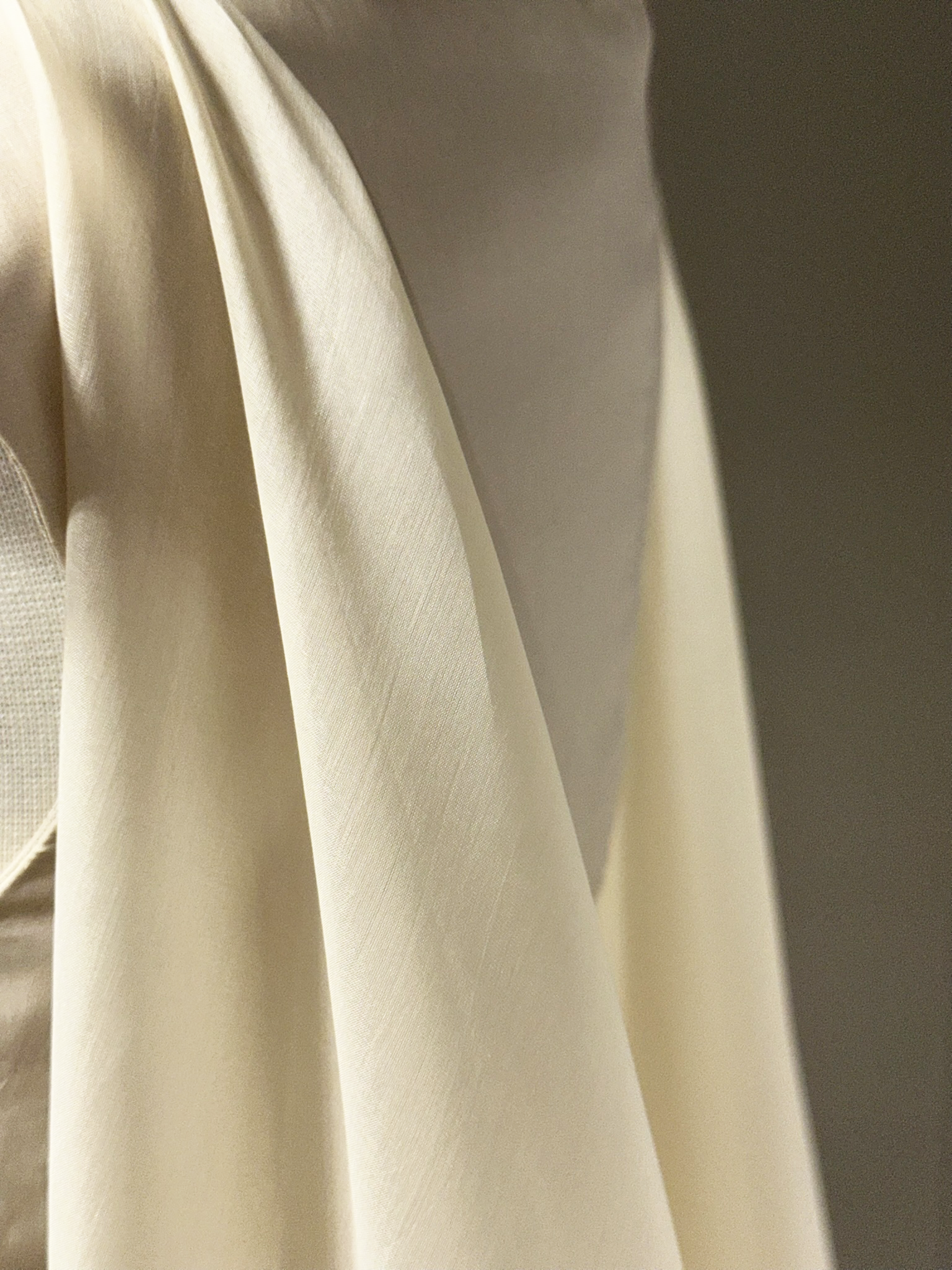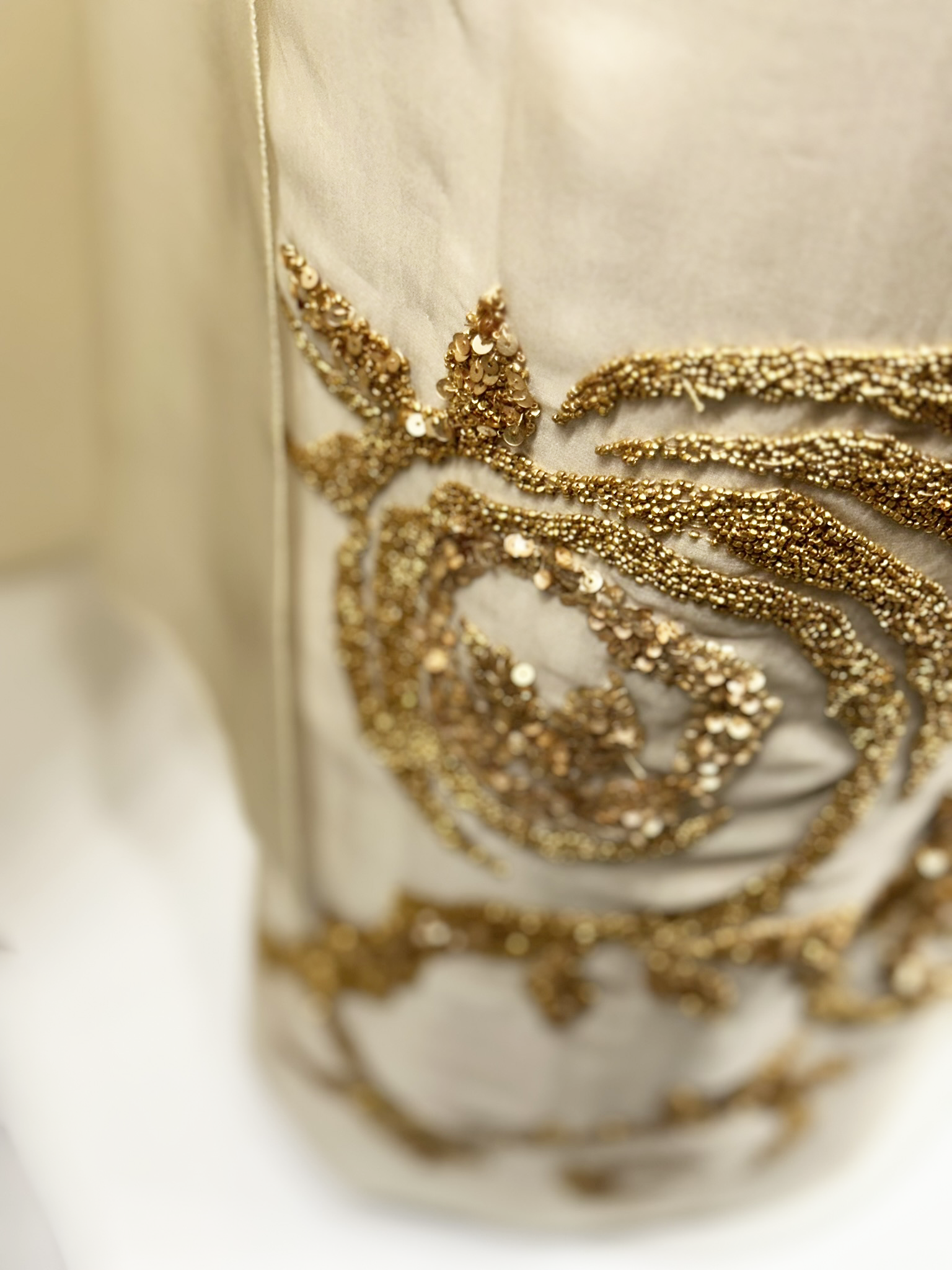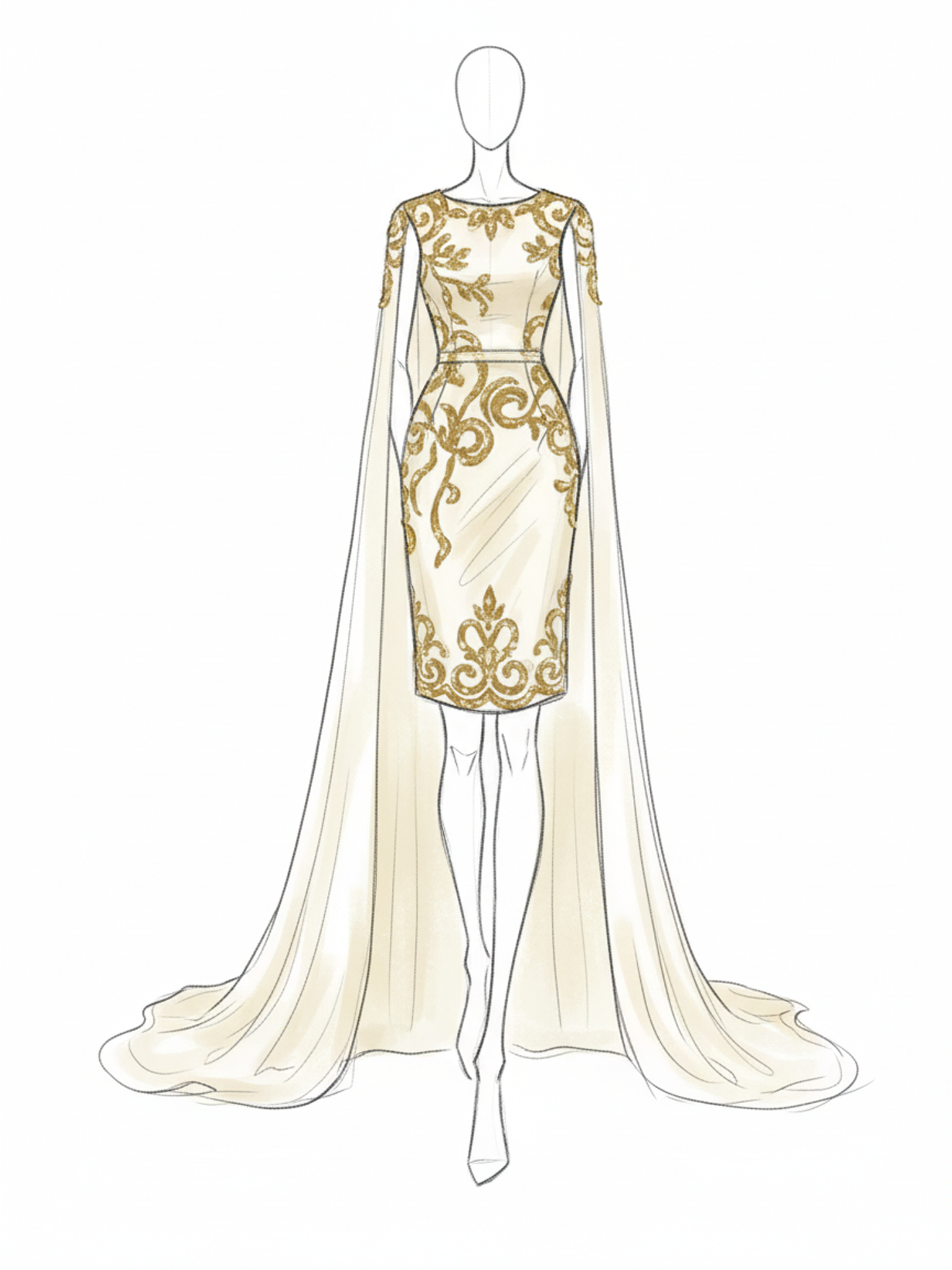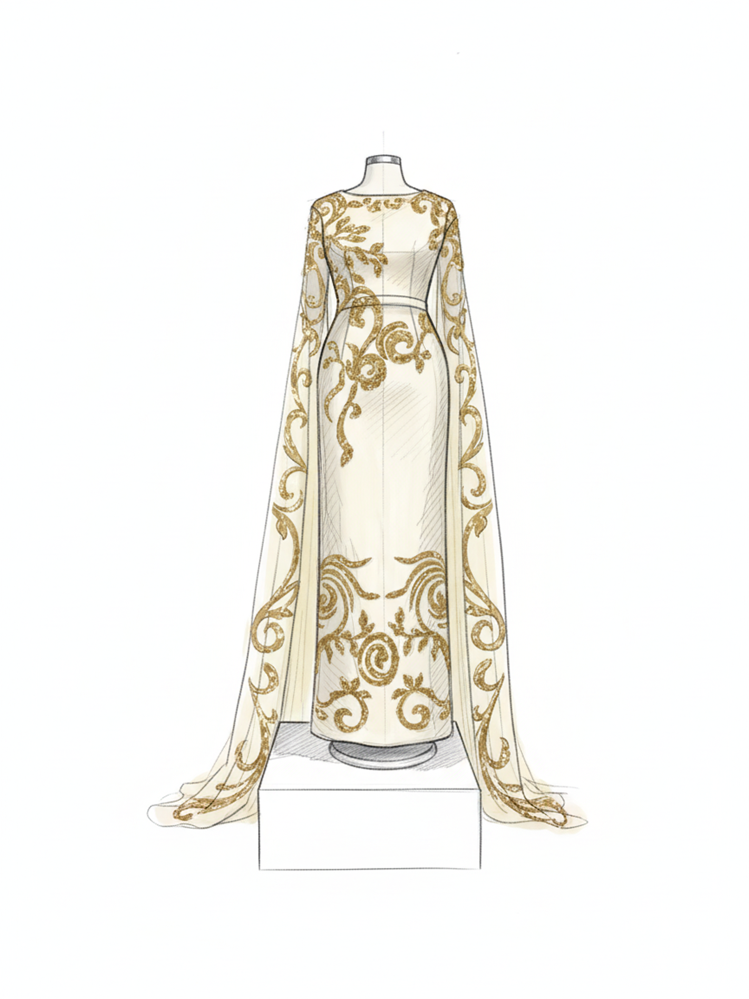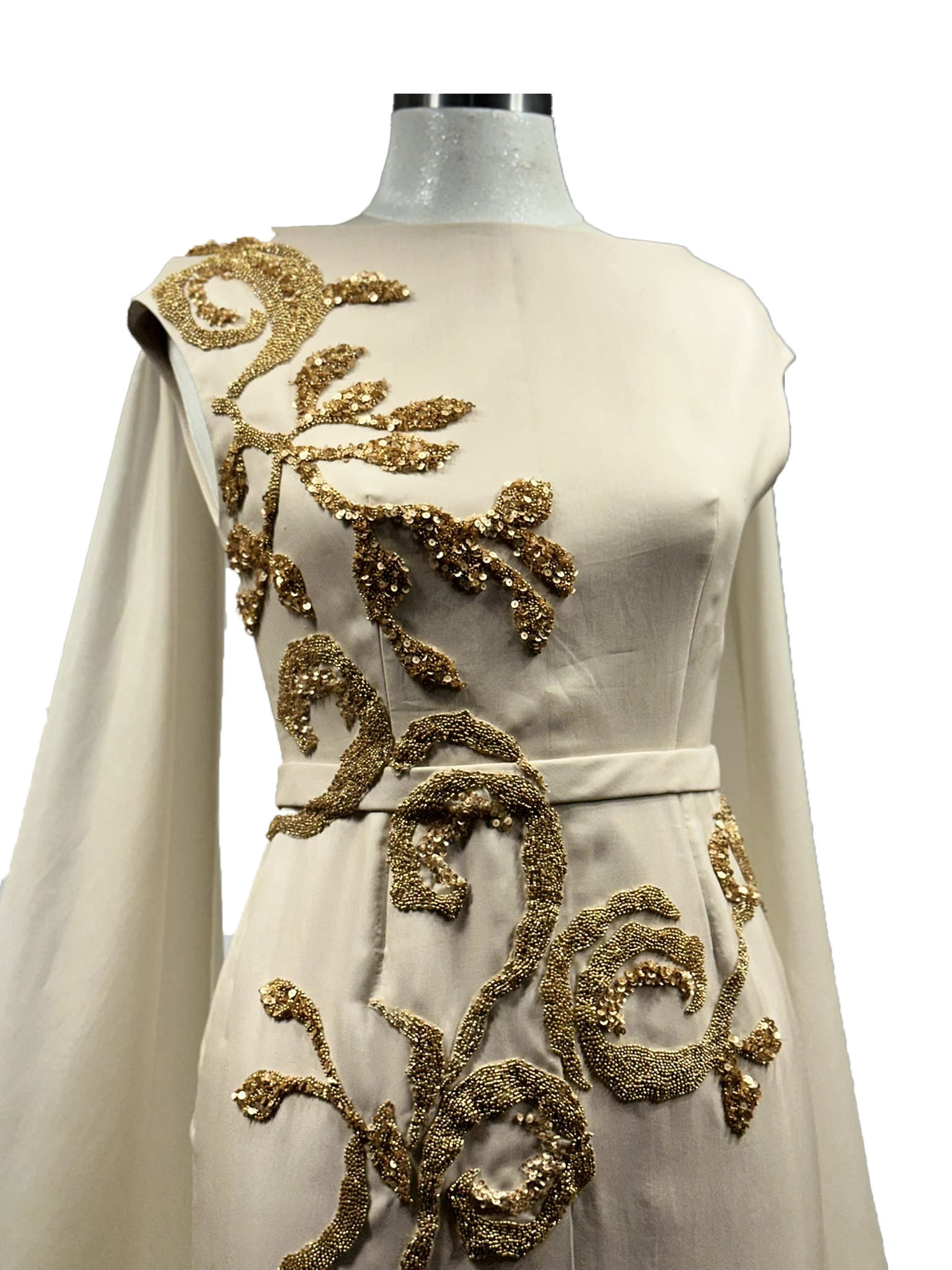 Altın işlemelerle vurgulanan tek omuz detayı, akışkan tül form üzerinde zamansız ve asil bir etki yaratır.