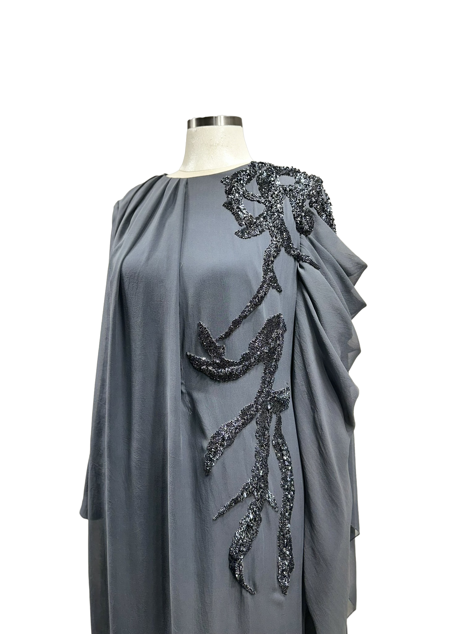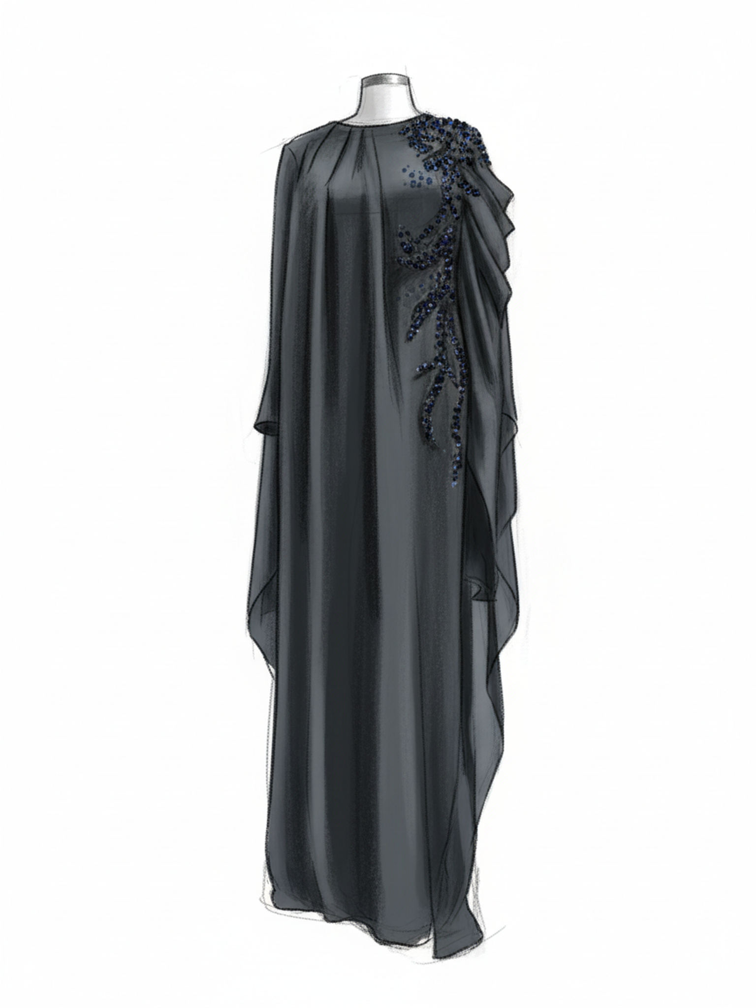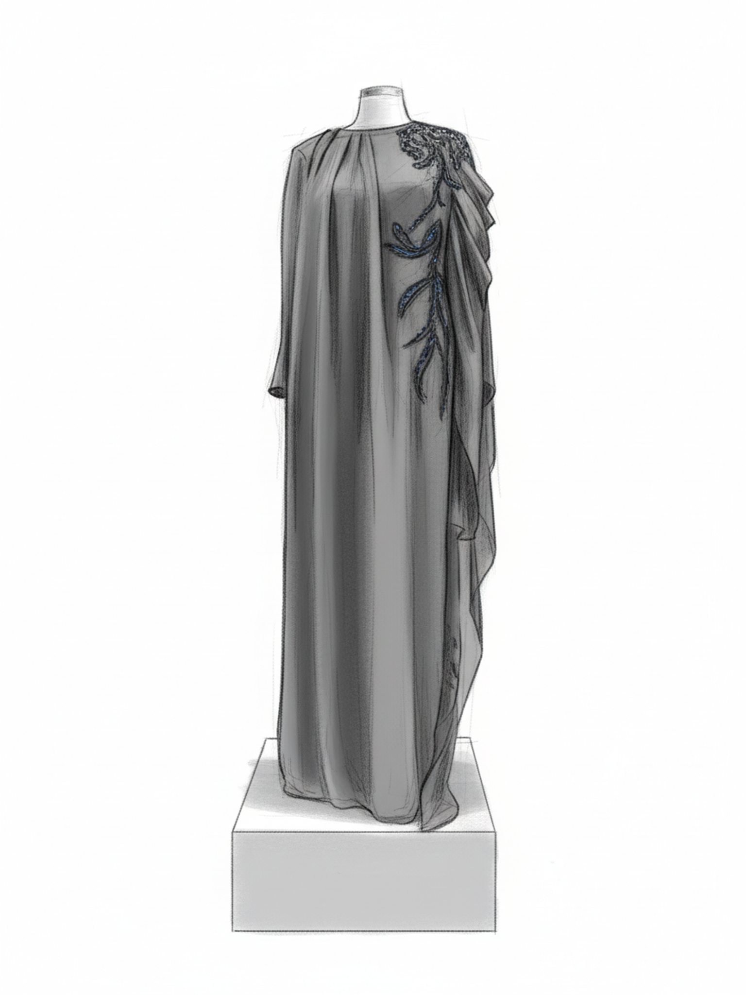 Akışkan kumaş ve asimetrik drape, tek omuzdan yükselen zarif işlemeyle birleşerek güçlü ve sade bir duruş yaratır.