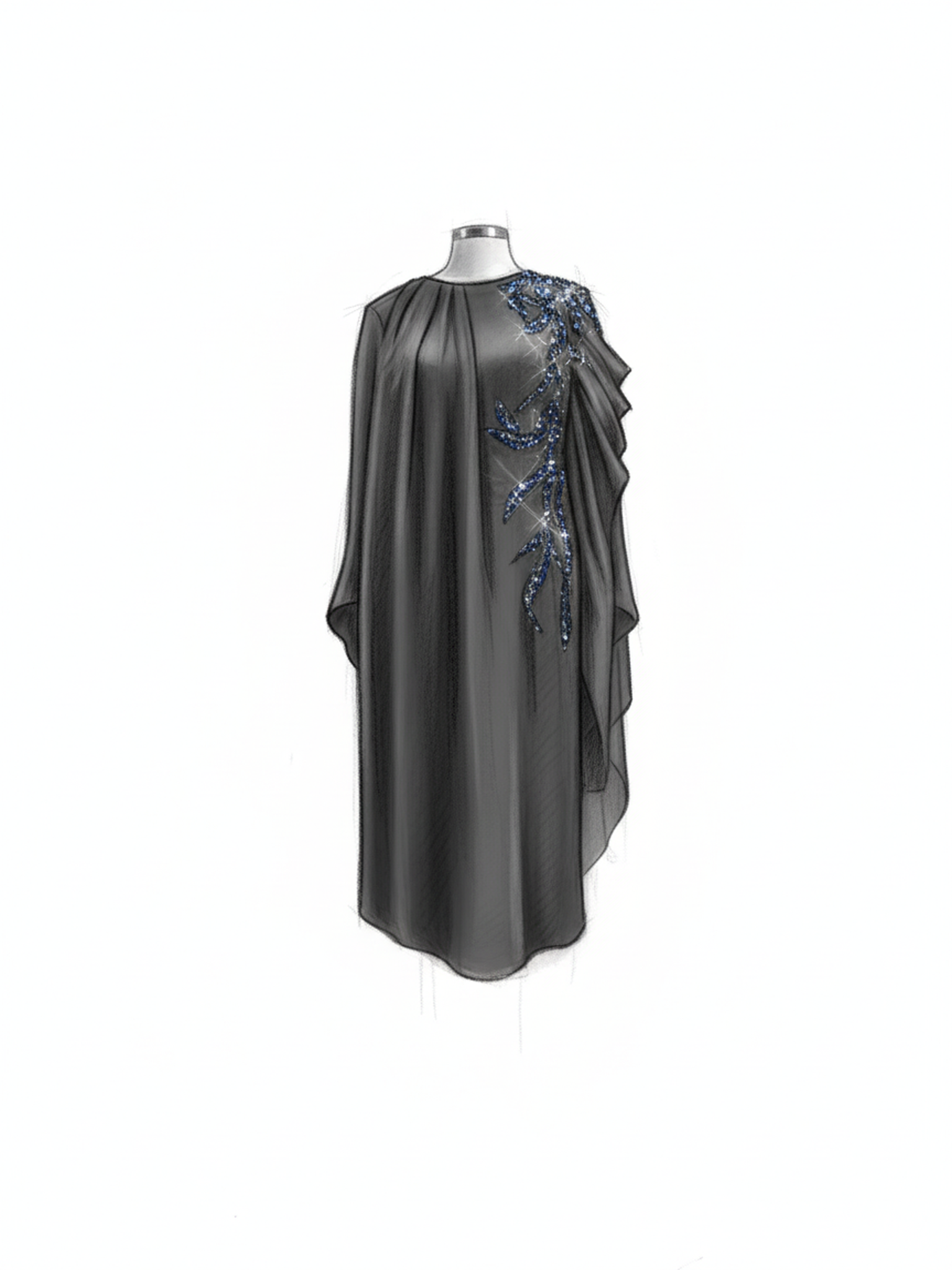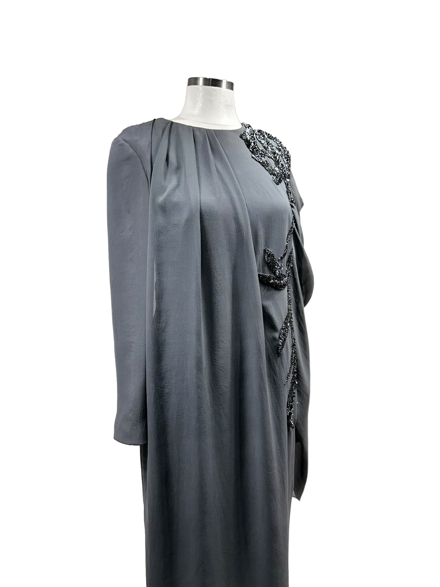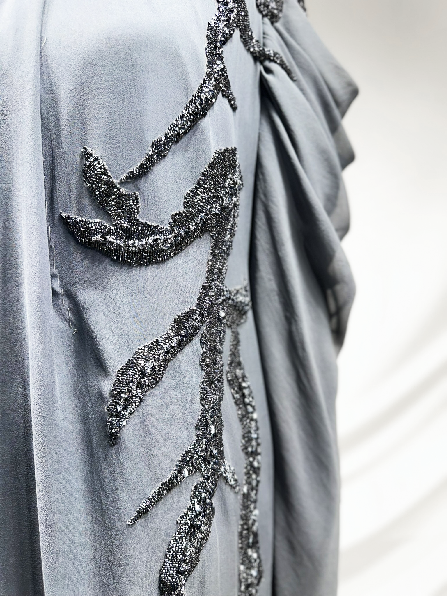 Akışkan kumaş ve asimetrik drape, tek omuzdan yükselen zarif işlemeyle birleşerek güçlü ve sade bir duruş yaratır.