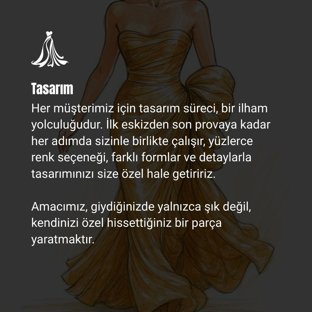 - “Elbette, tasarım sürecimiz tamamen size özel ilerliyor.” İlk taslak oluşturulduktan sonra, model, kumaş veya detaylarda görmek istediğiniz değişiklikleri birlikte değerlendirebiliriz. Amacımız, hayalinizdeki elbiseyi sizin tarzınızı yansıtacak şekilde mükemmelleştirmek. Bu nedenle her adımda sizin onayınız alınır; prova sürecinde de gerekli revizyonlar özenle yapılır.