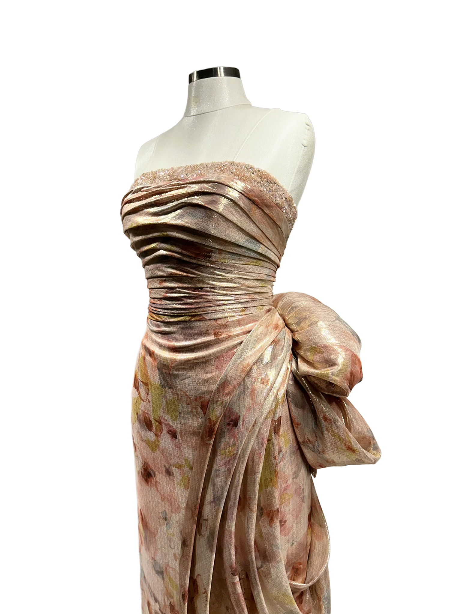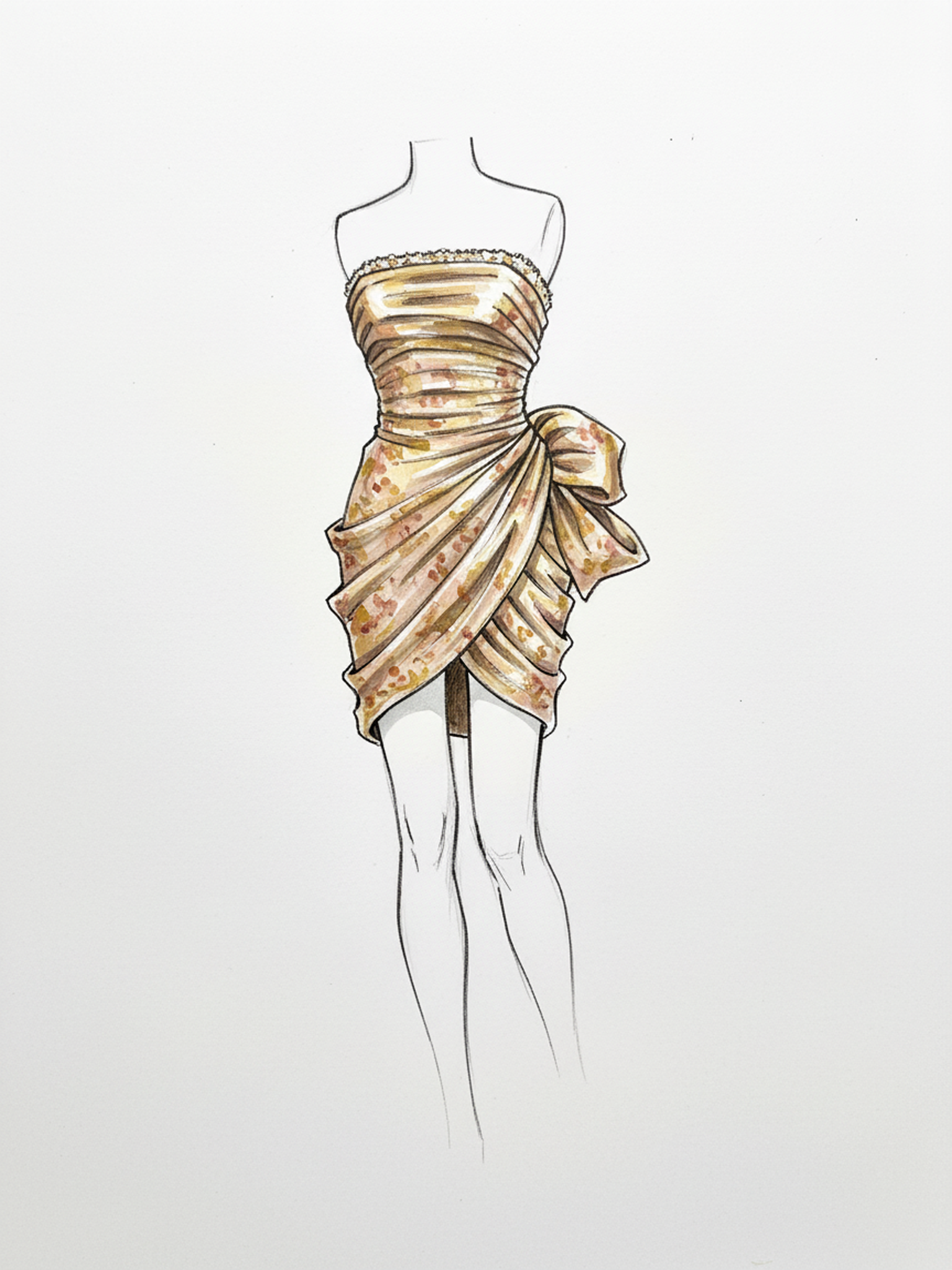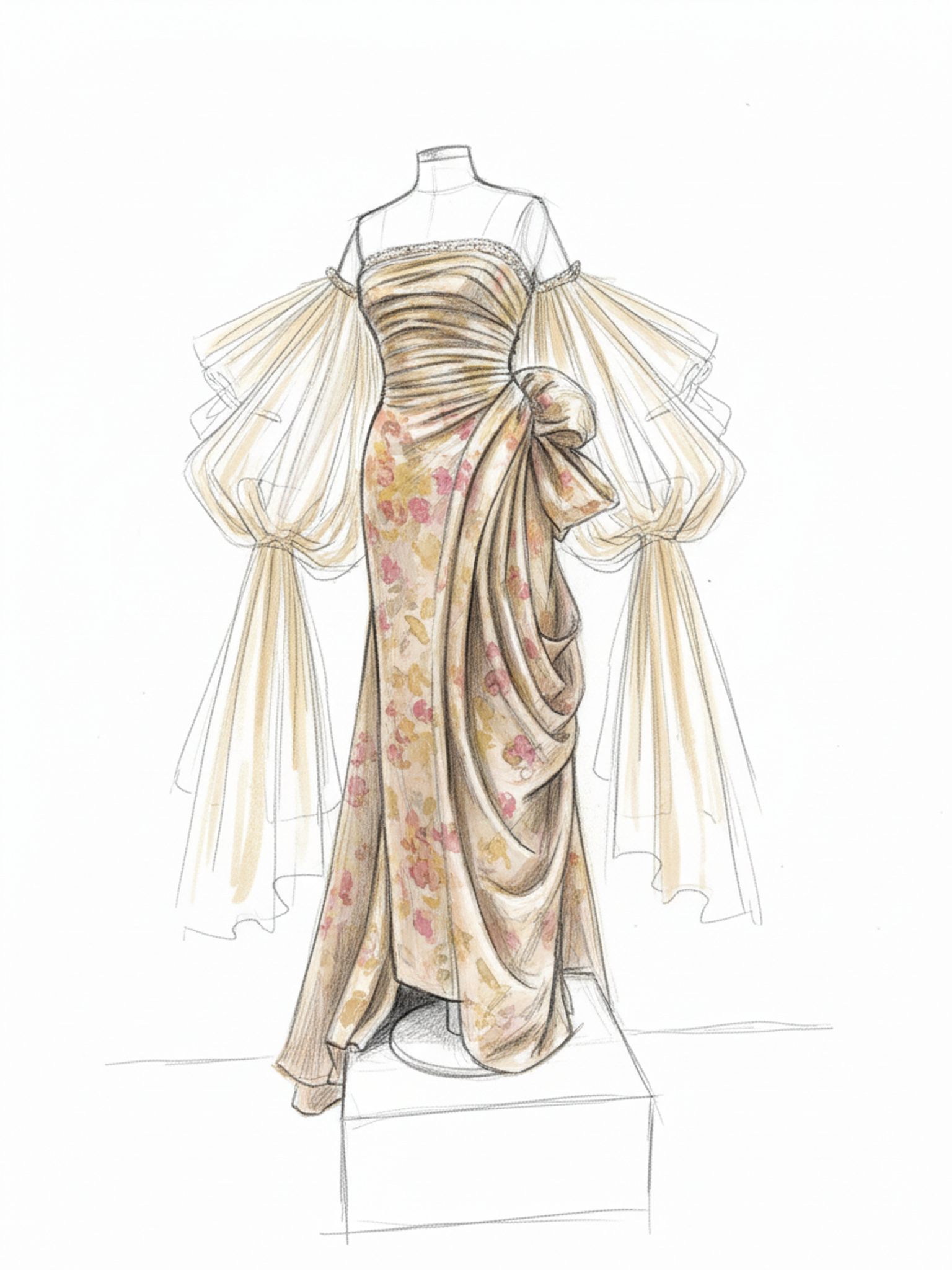Işıltılı drapeler ve beldeki heykelsi fiyonk, kumaşın akışını vurgulayarak feminen ve sofistike bir siluet oluşturur.