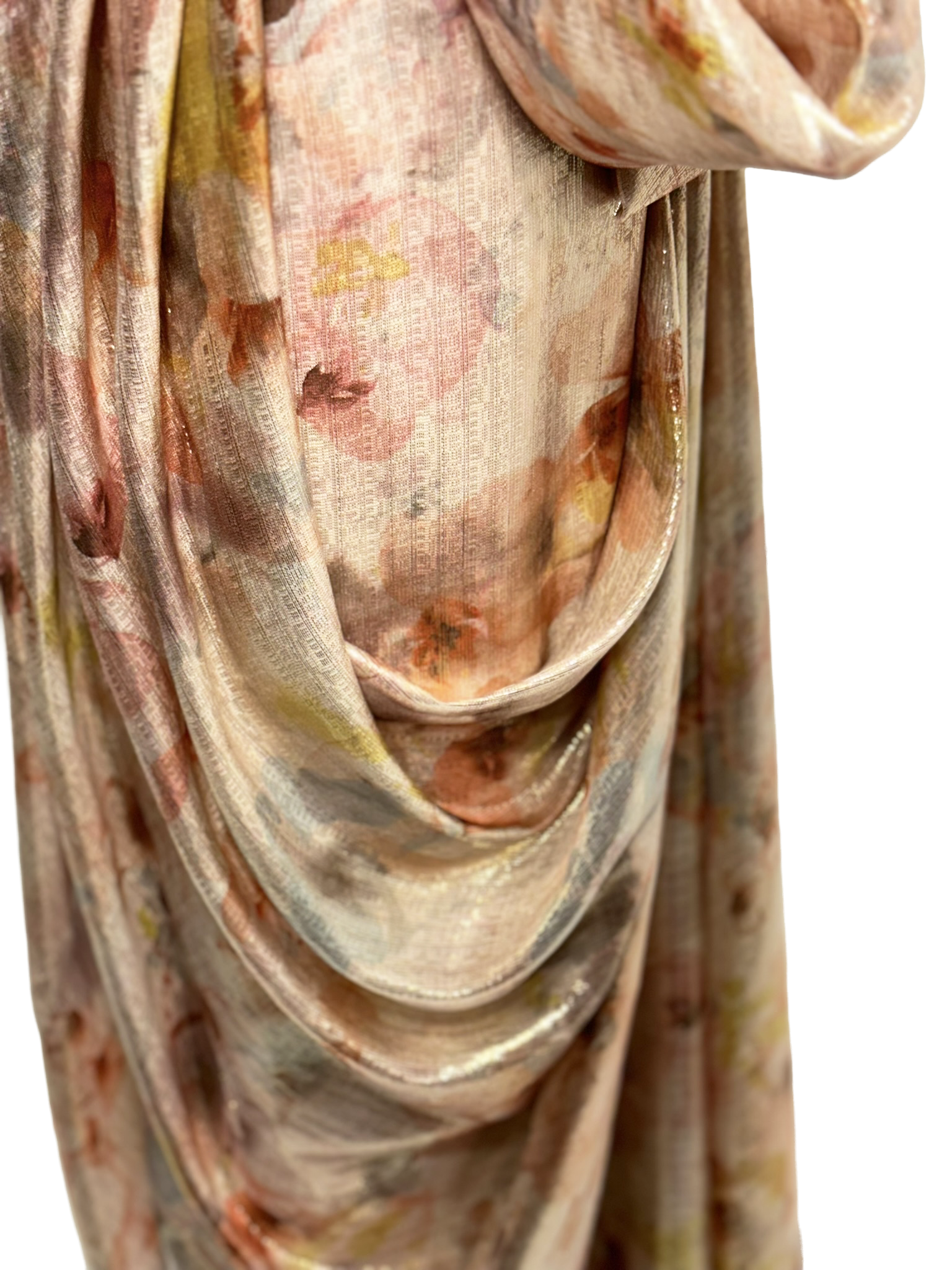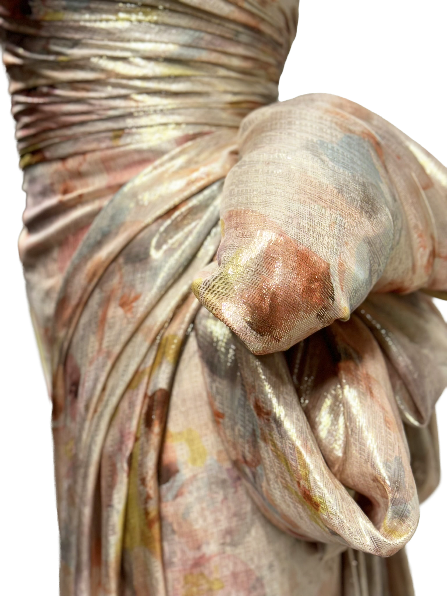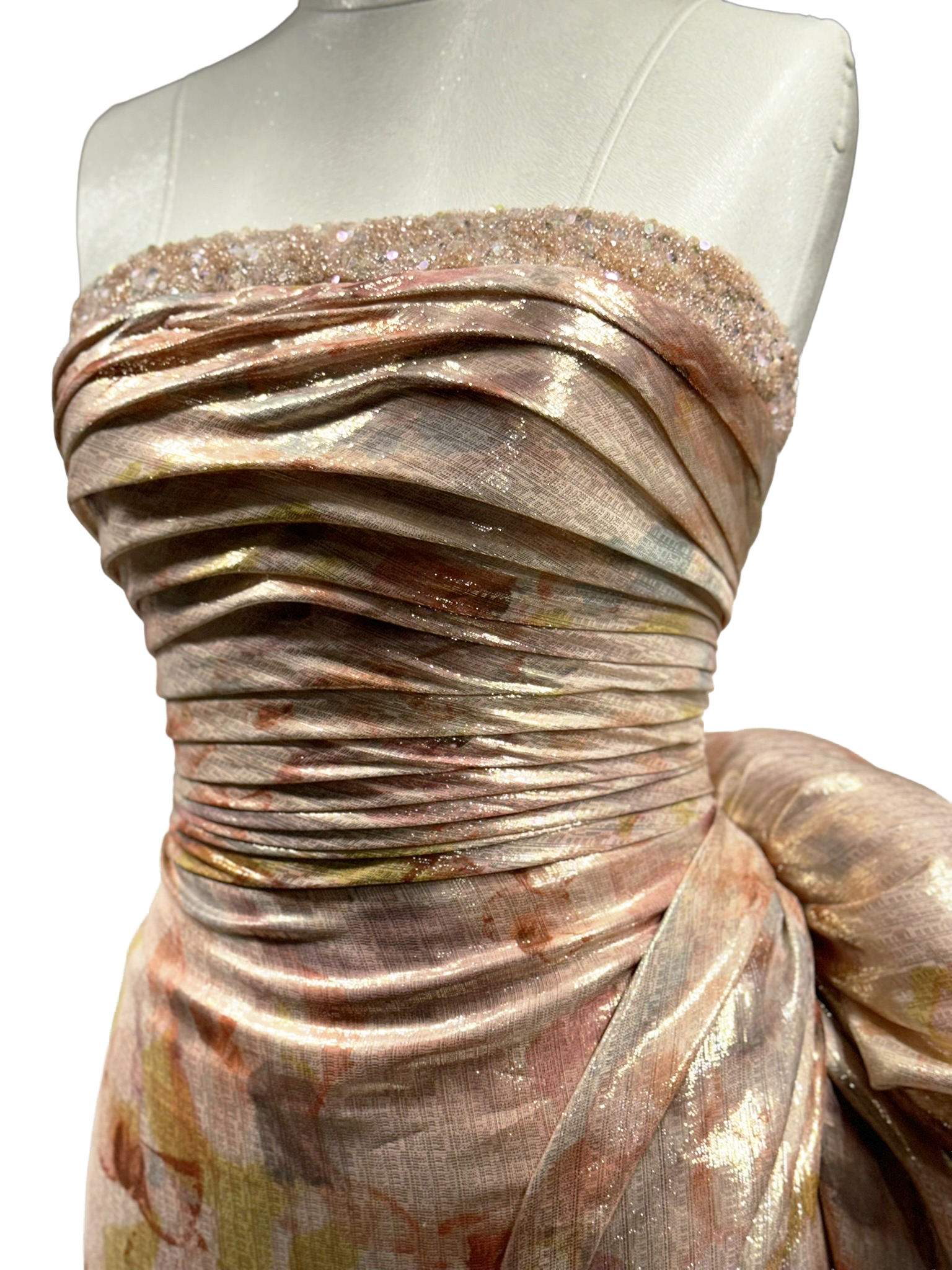 Işıltılı drapeler ve beldeki heykelsi fiyonk, kumaşın akışını vurgulayarak feminen ve sofistike bir siluet oluşturur.