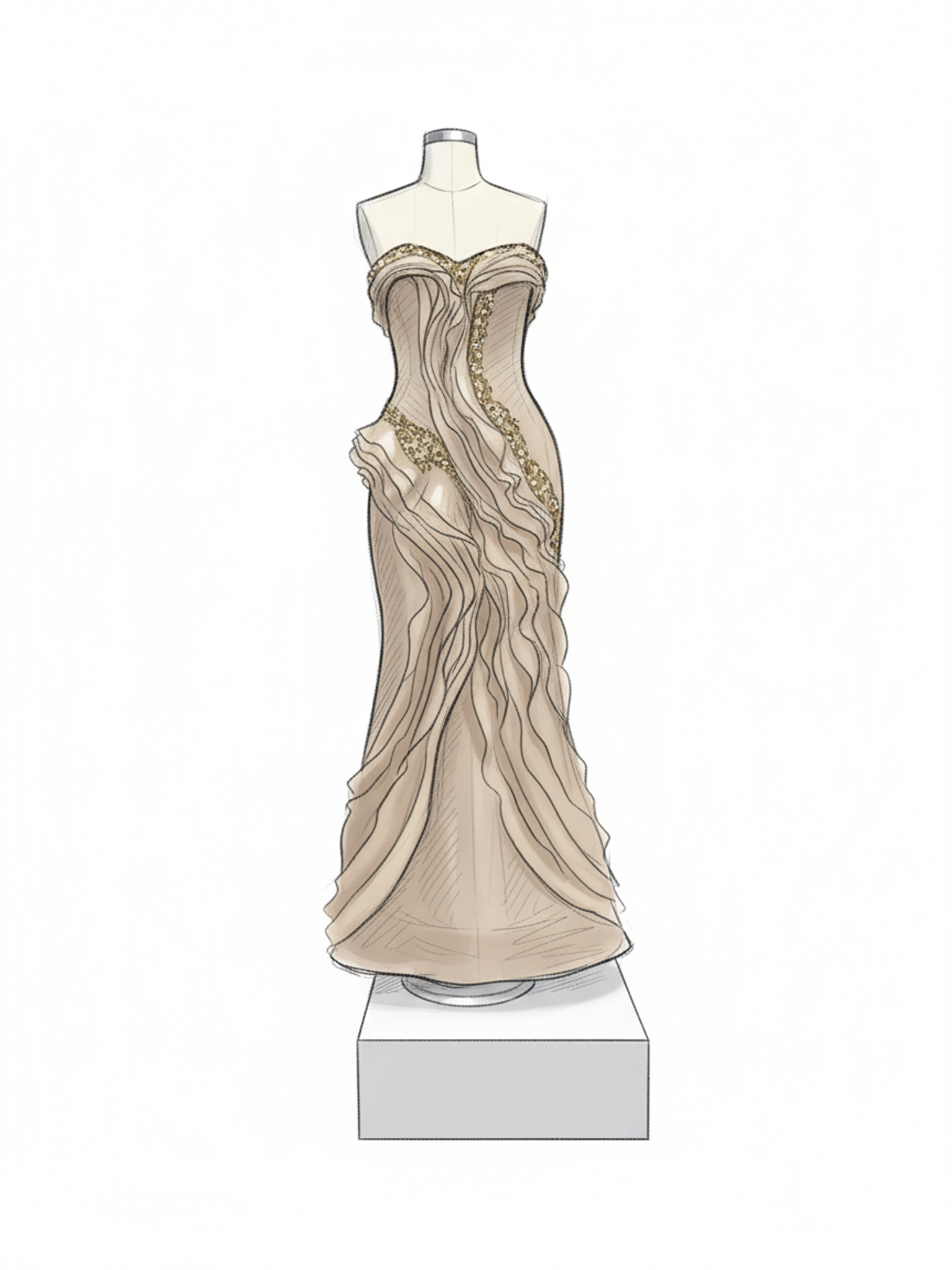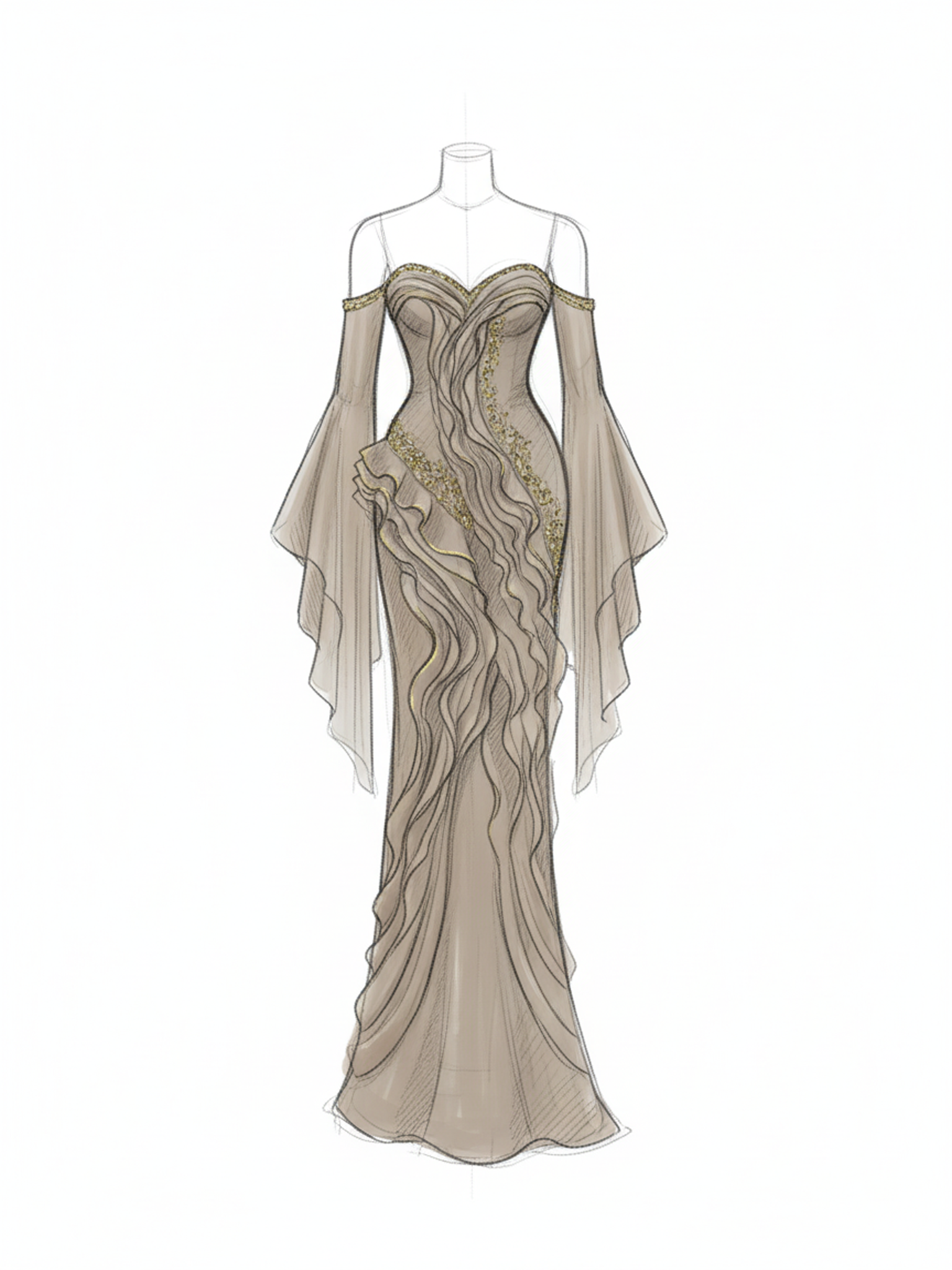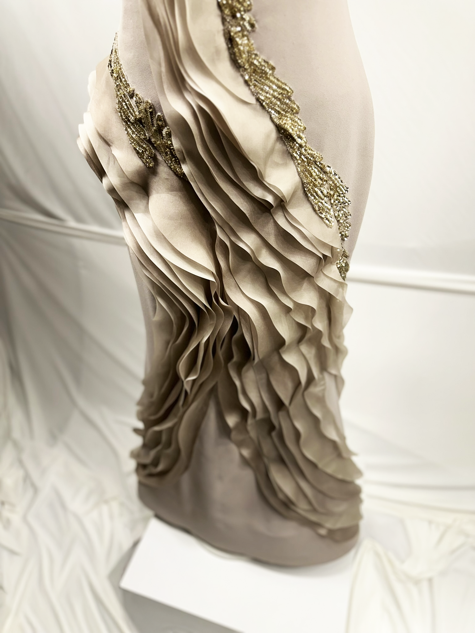 Heykelsi drapeler ve zarif işlemeler, bedeni saran formda akışkan ve sofistike bir etki yaratır.