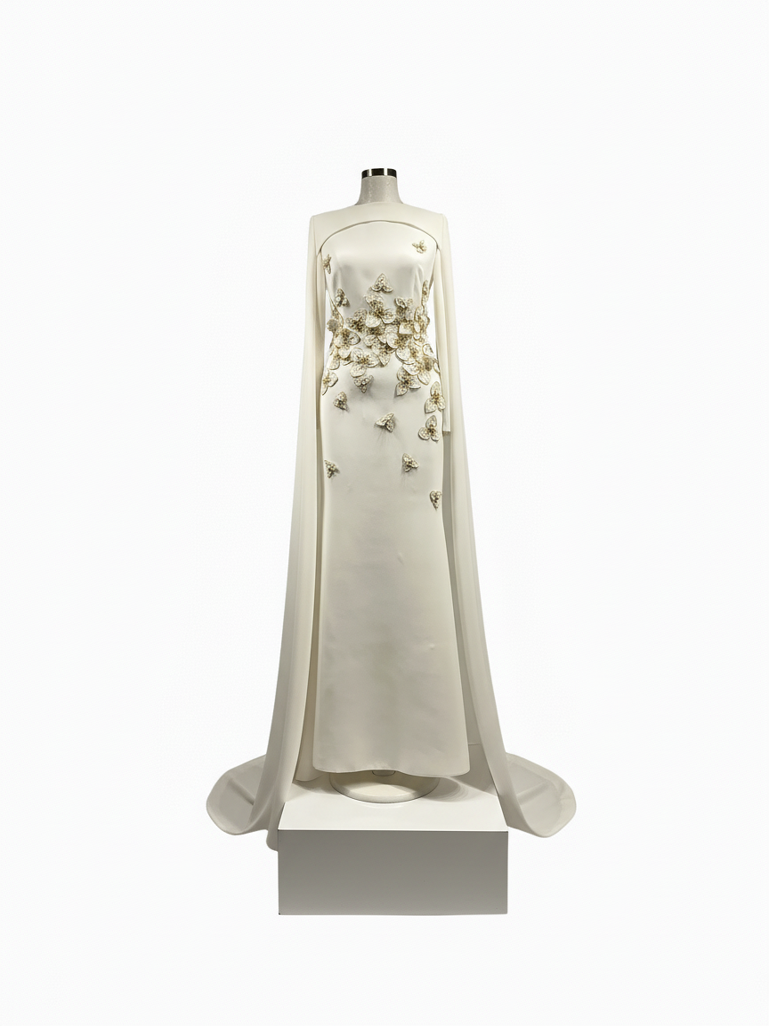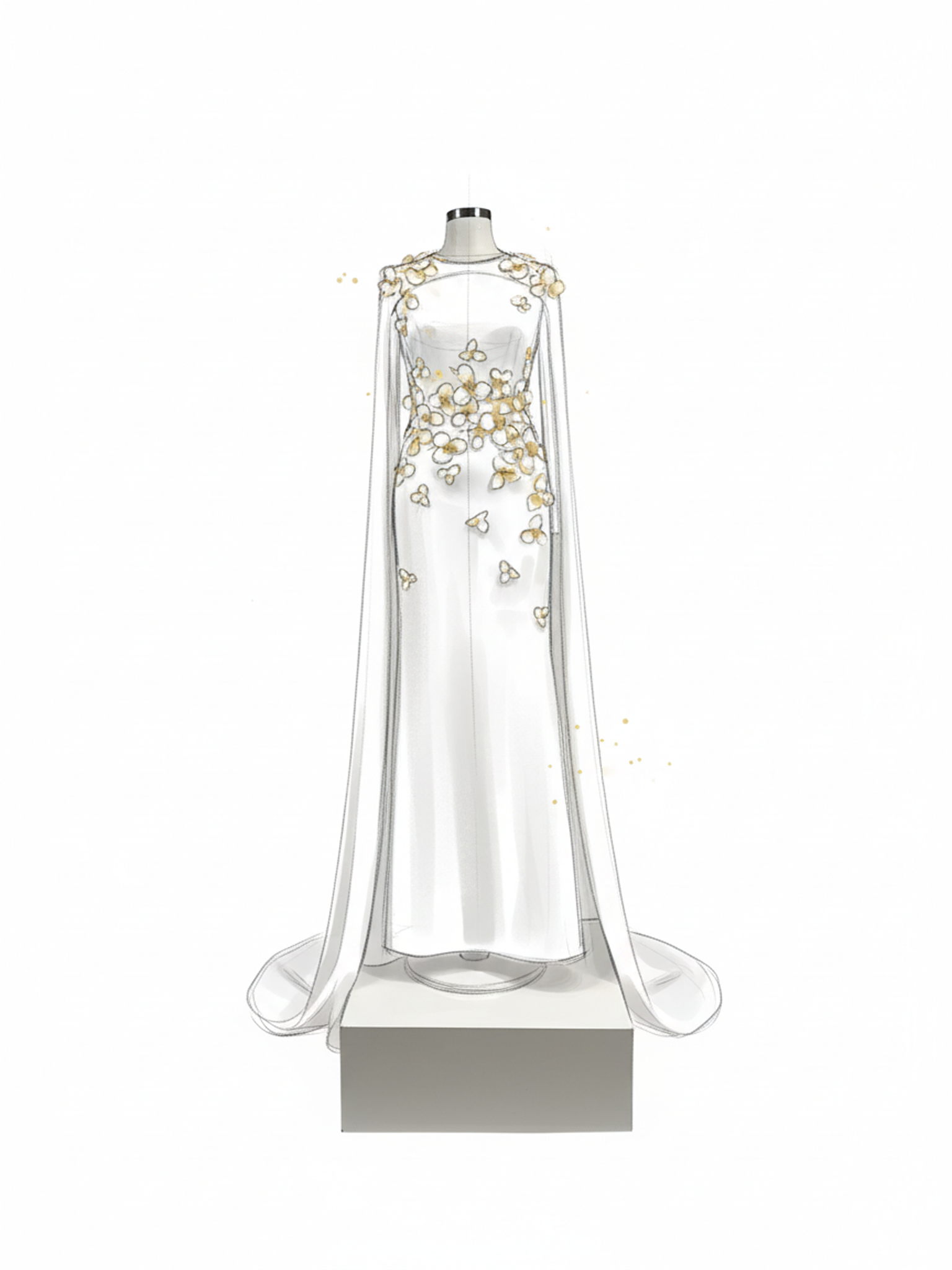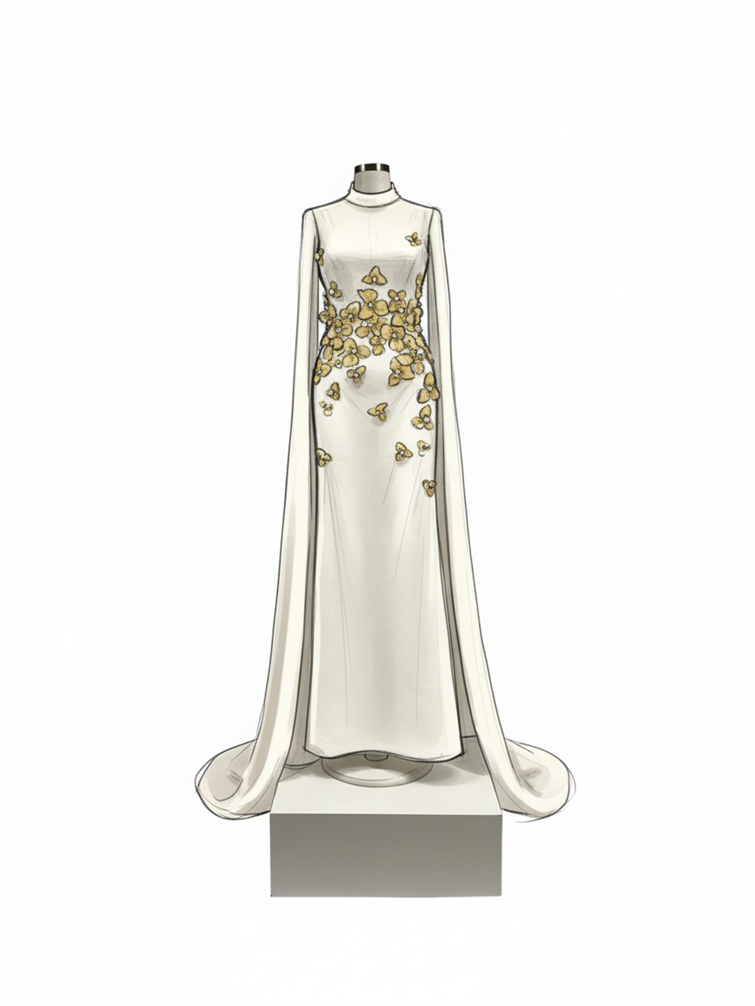 Omuzlardan dökülen pelerin formu, tasarıma zamansız bir asalet ve modern bir dramatik etki kazandırır.