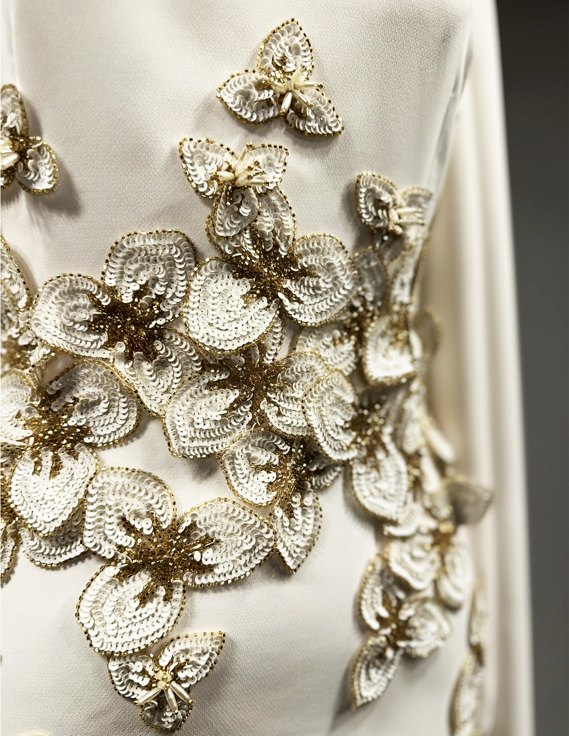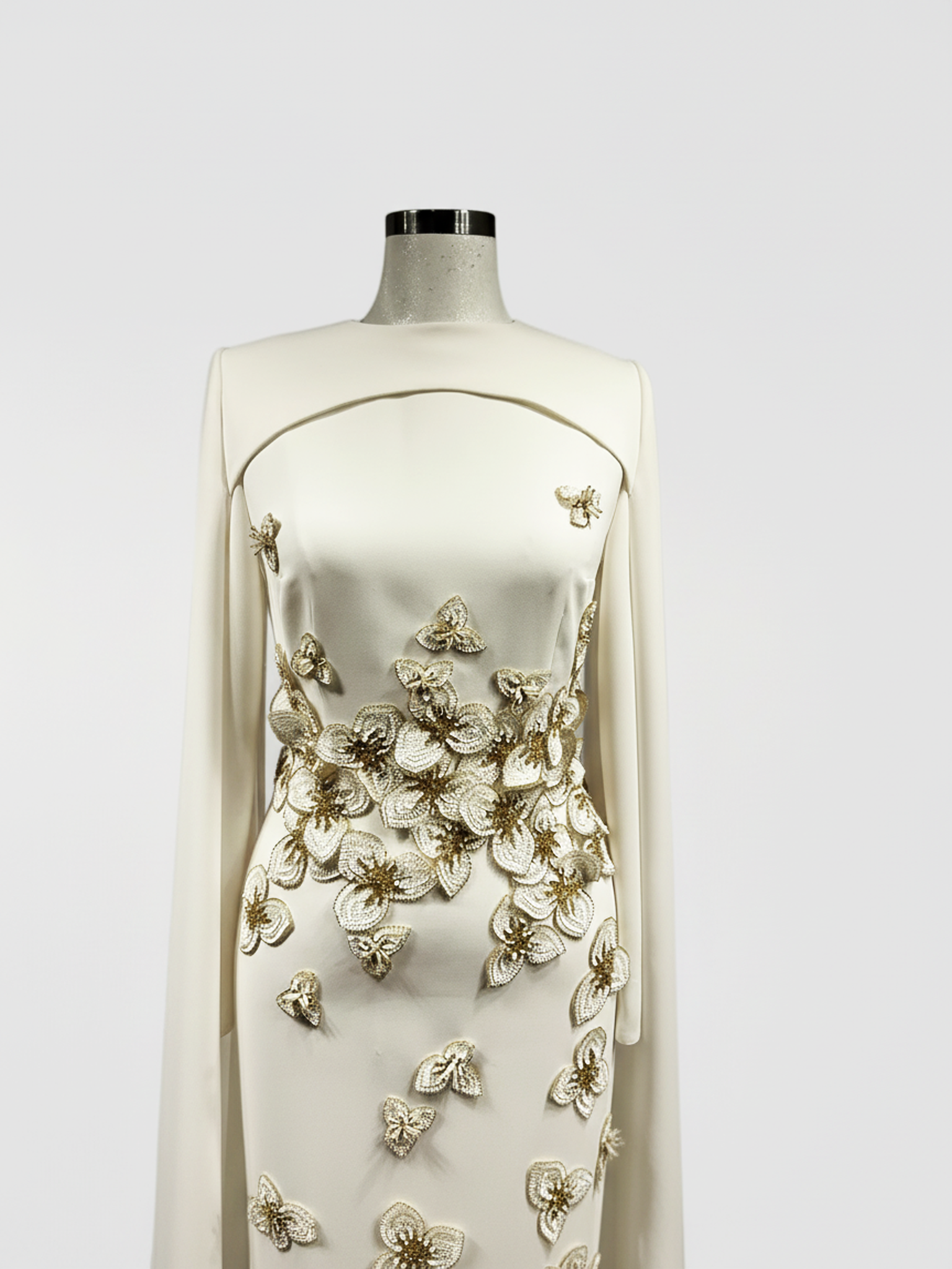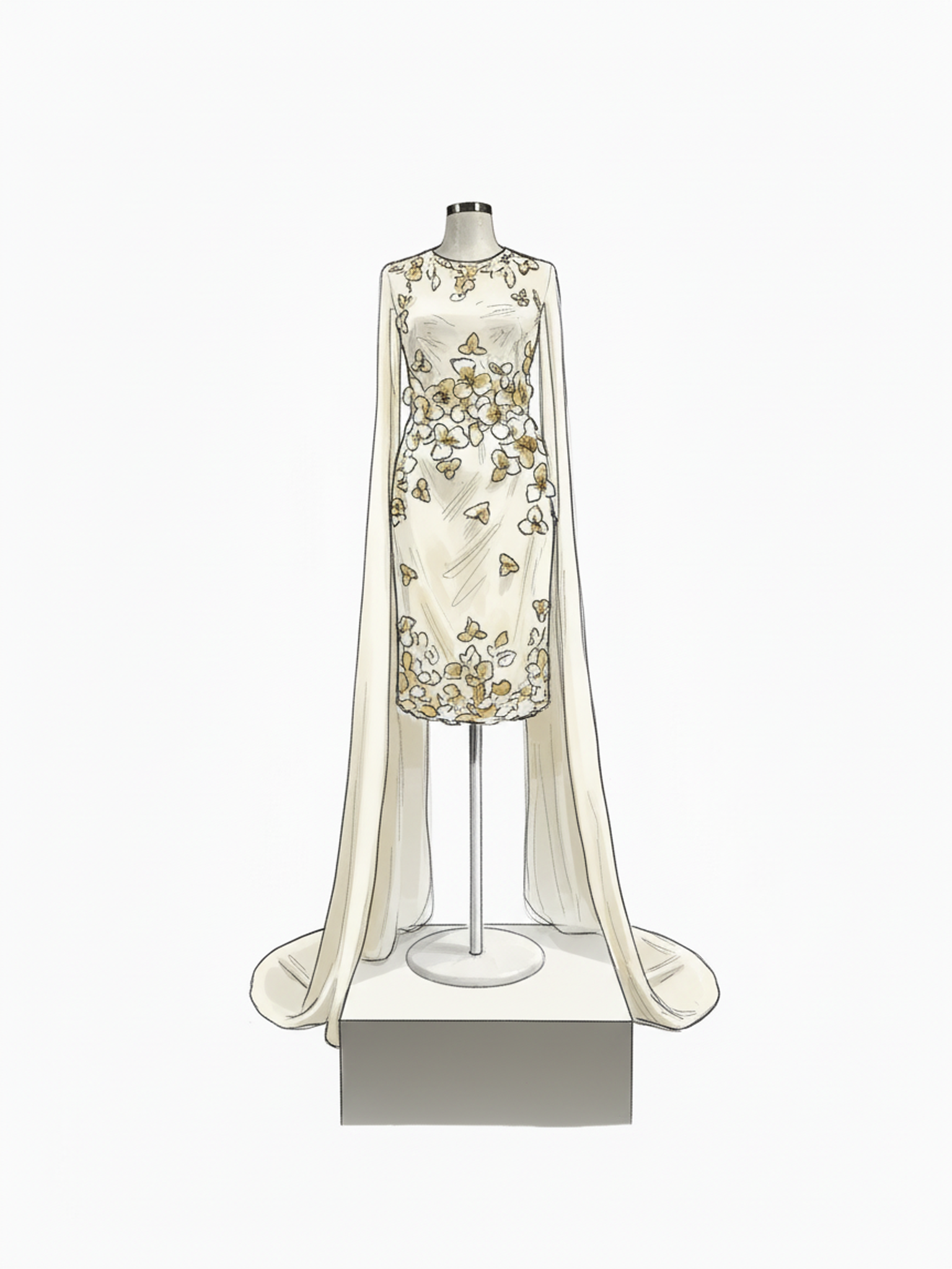 Omuzlardan dökülen pelerin formu, tasarıma zamansız bir asalet ve modern bir dramatik etki kazandırır.
