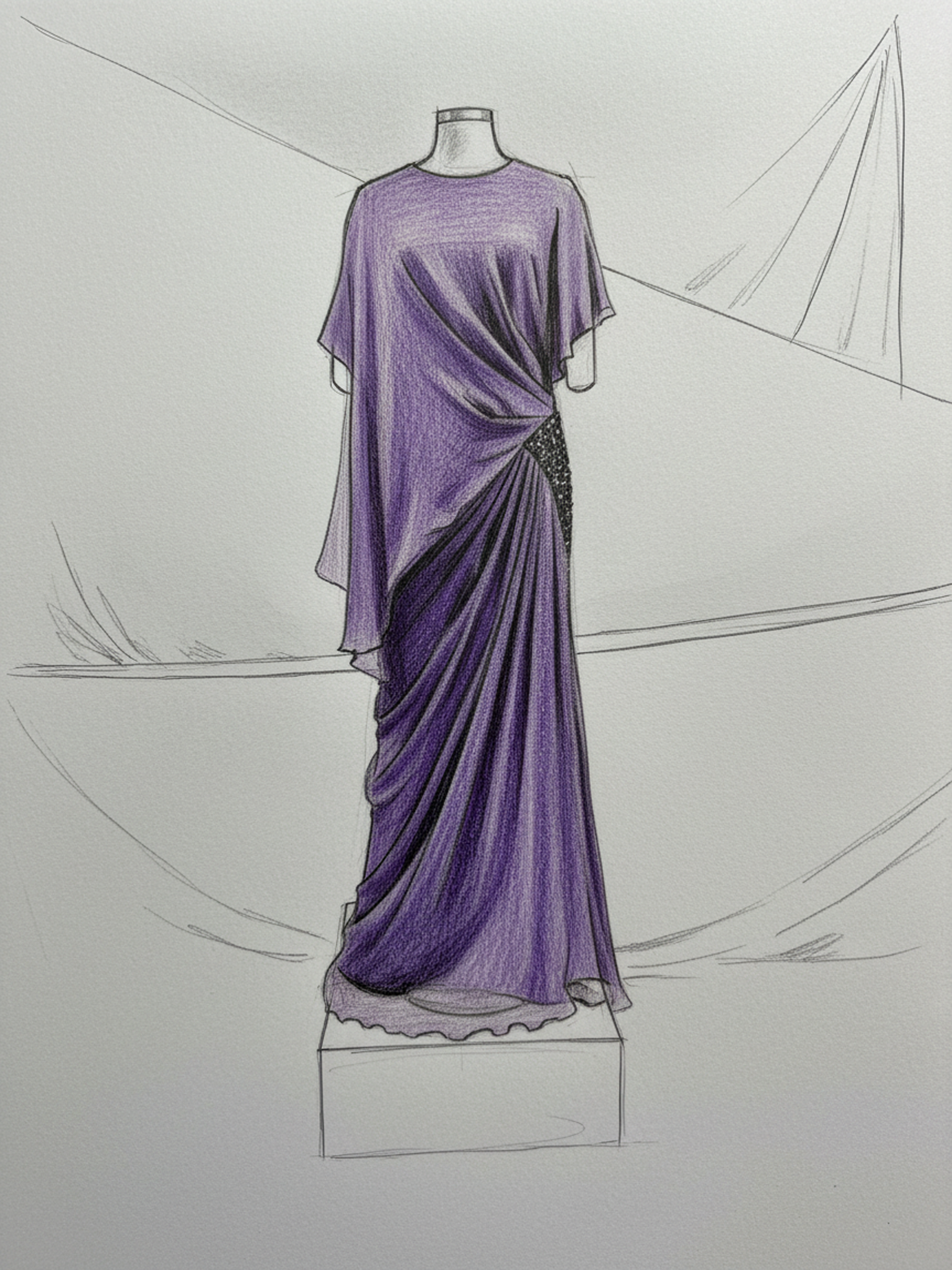 Derin mor tonların asaleti, yumuşak dökümlü şifon katmanlarla bedeni saran bir akışa dönüşüyor. Asimetrik drapeler hareketi vurgularken, bel hattında yer alan ışıltılı dokunuş tasarıma kontrollü bir ihtişam katıyor. Gücünü sadelikten alan bu siluet, zamansız bir zarafeti modern bir duruşla buluşturuyor.