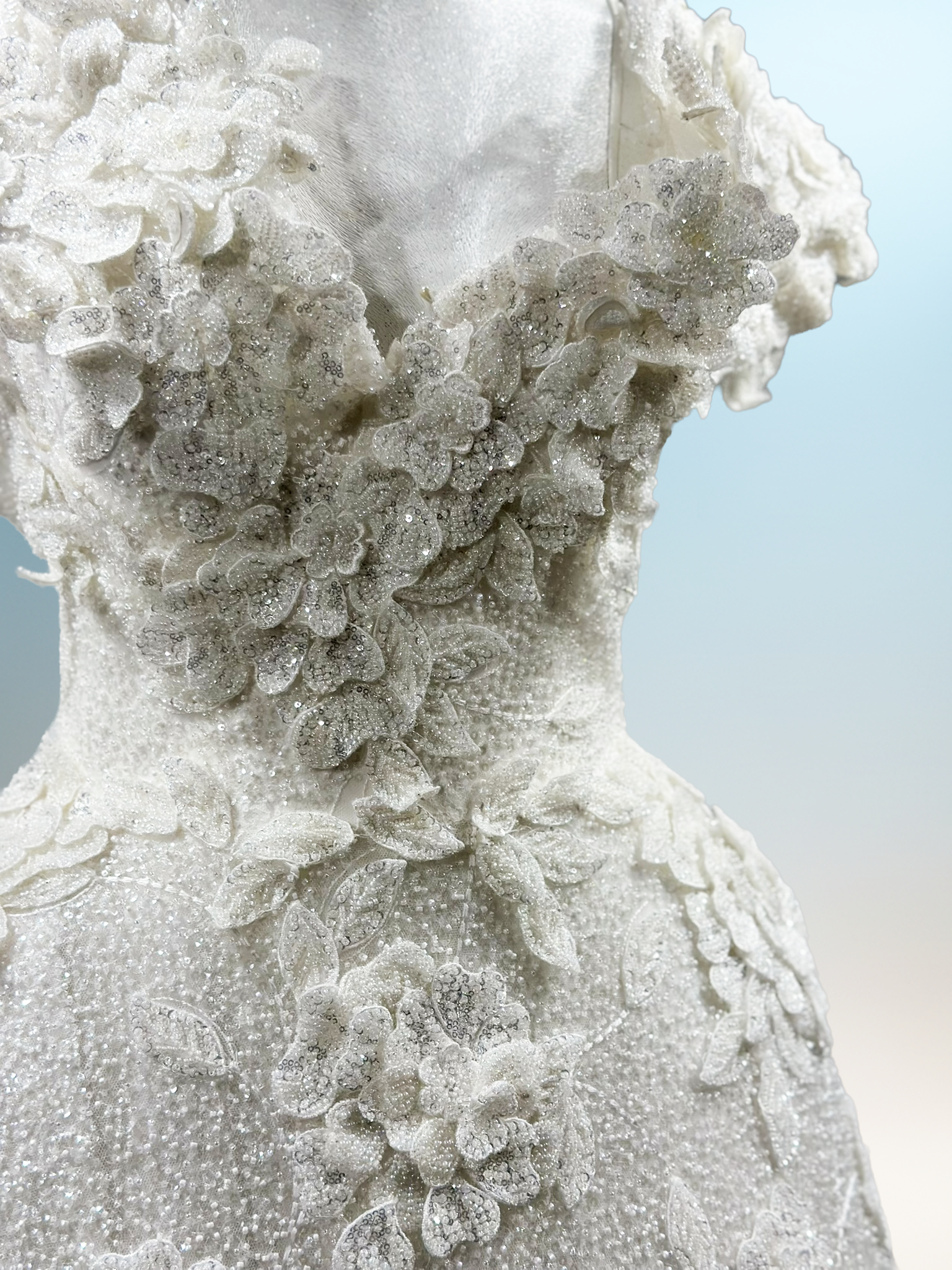 Hafif dokulu yüzeyi ve zarif çiçek aplikeleriyle bu siluet, romantik bir sadeliği çağdaş bir duruşla birleştirir. Yumuşak hacim ve dengeli form, zamansız bir couture zarafeti sunar.