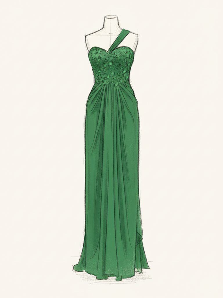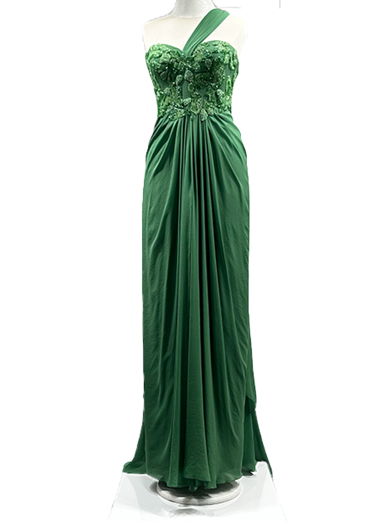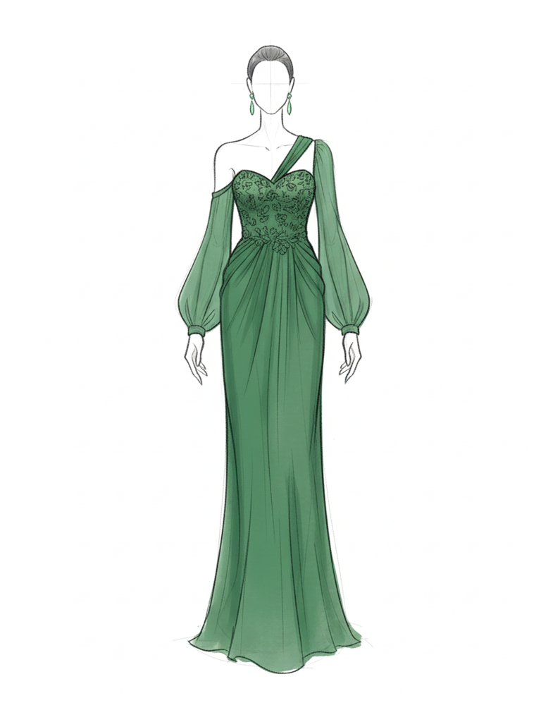 “Bu tasarımda yeşilin sakin gücünü öne çıkarmak istedim. Tek omuzdan geçen modern kesim, doğal bir akışı çağrıştırırken; gövdedeki çiçek işlemeleri ormanın kalbinde açan sessiz bir güzellik gibi elbiseye hayat veriyor. Yumuşak dökümlü etek, her adımda hafif bir rüzgârın nefesini taşır. Elbisenin ruhu: doğal zarafet ve sade ihtişam.”