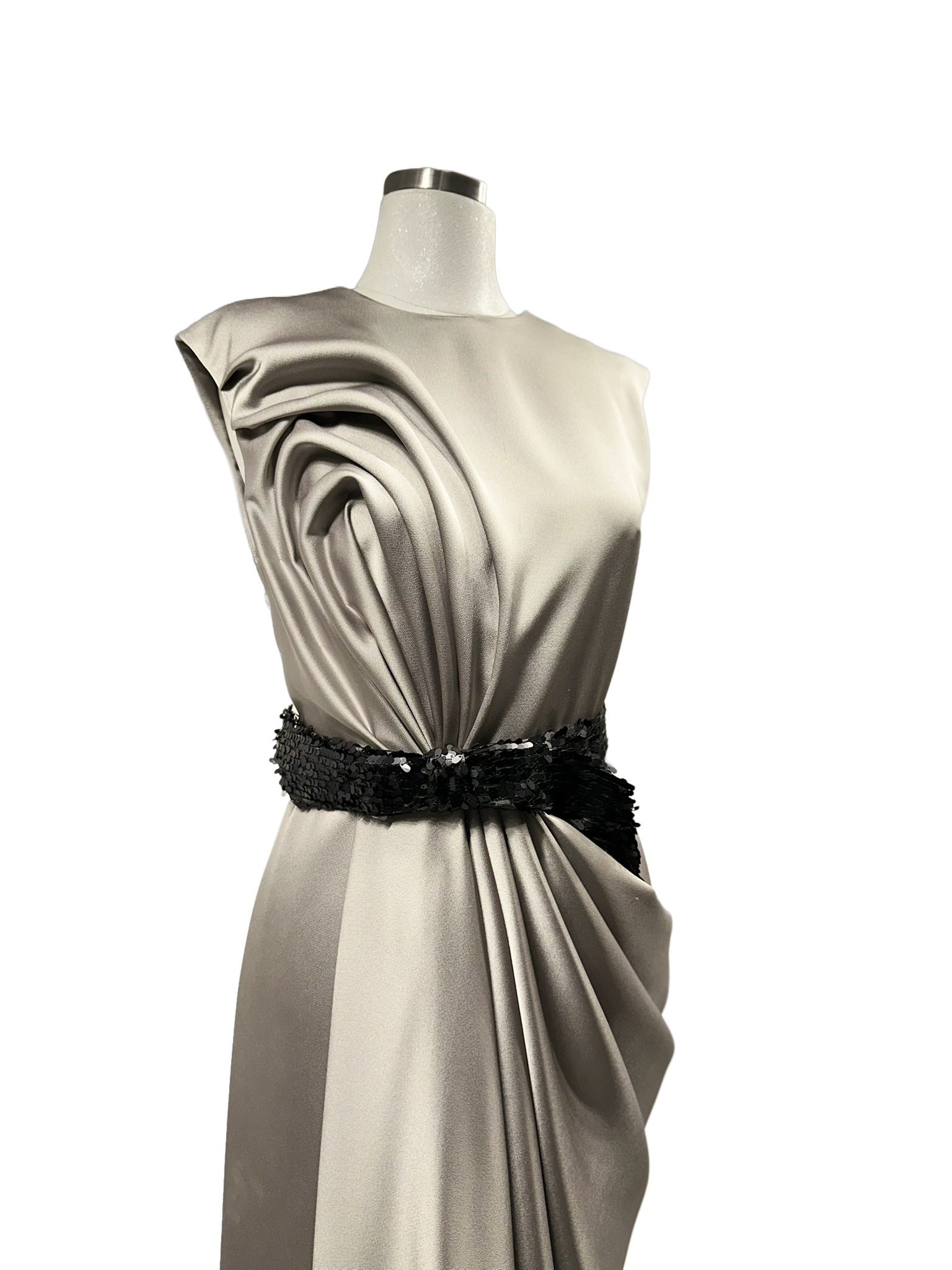 Akışkan saten, heykelsi drapelerle form kazanırken siyah payet kemer tasarıma güçlü bir kontrast ve modern bir vurgu katar. Zamansız, sade ve dengeli bir siluet hedeflendi.