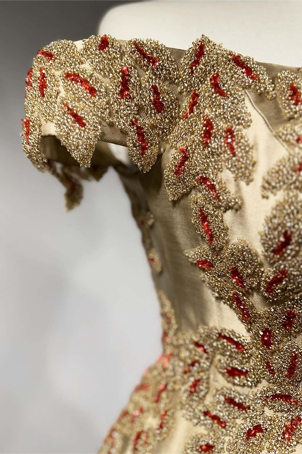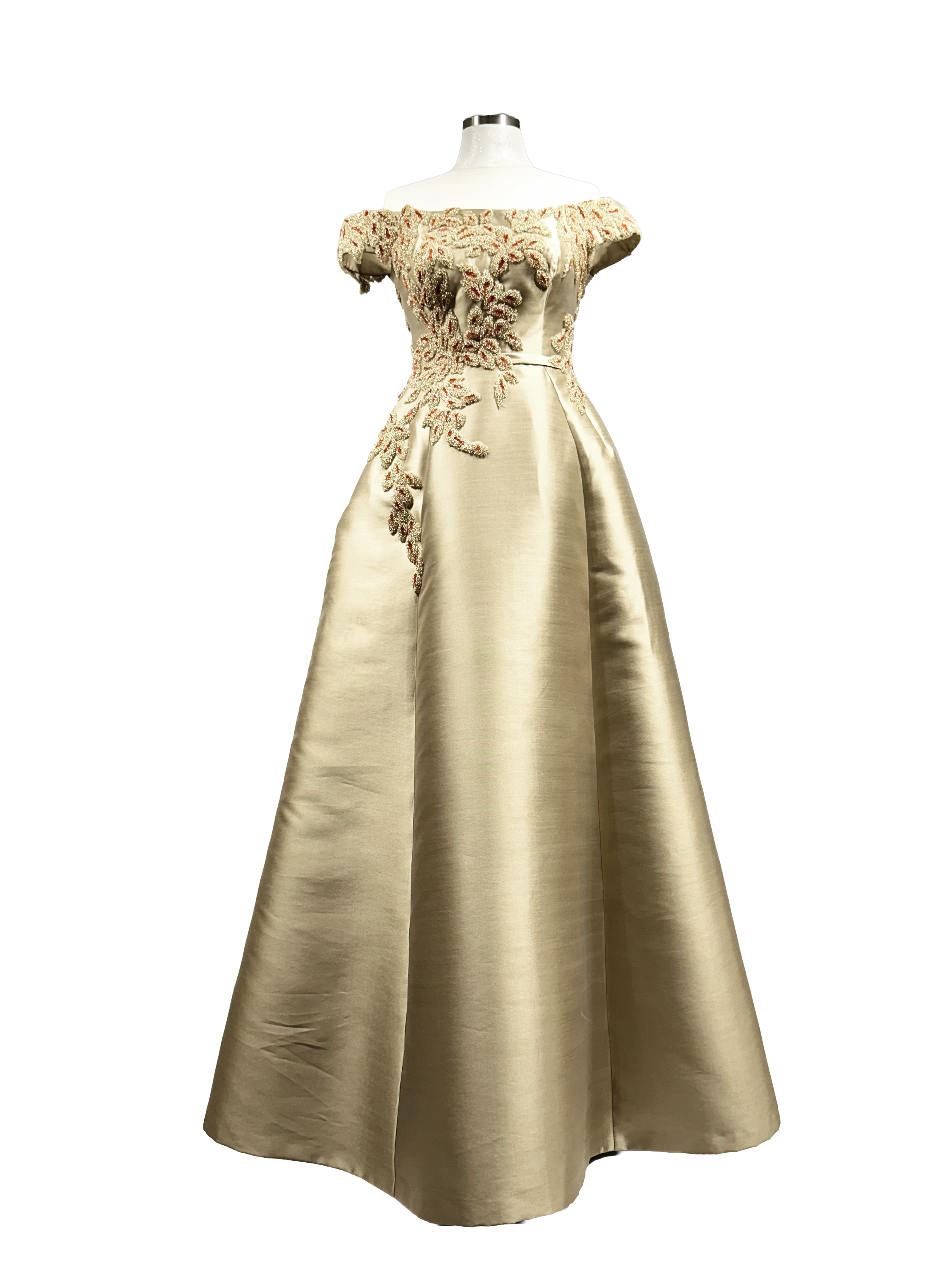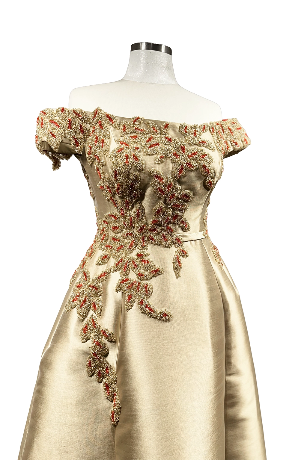 “Bu tasarımda altının asaleti ile kusursuz kalıbın gücünü buluşturmak istedim. Omuzdan dökülen zarif çiçek işlemeleri, klasik bir silueti güncel bir ifadeyle yeniden yorumluyor. Parlak yüzeyli kumaş, her adımda ışığı tutarak elbiseye ihtişamlı bir akış kazandırıyor. Amacım; hem zamansız hem de etkileyici bir duruş yaratmaktı.”