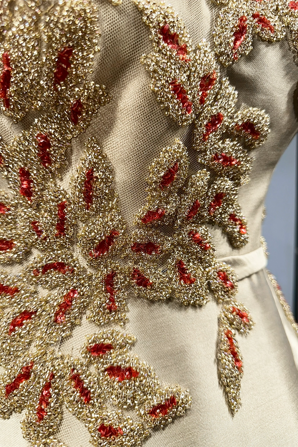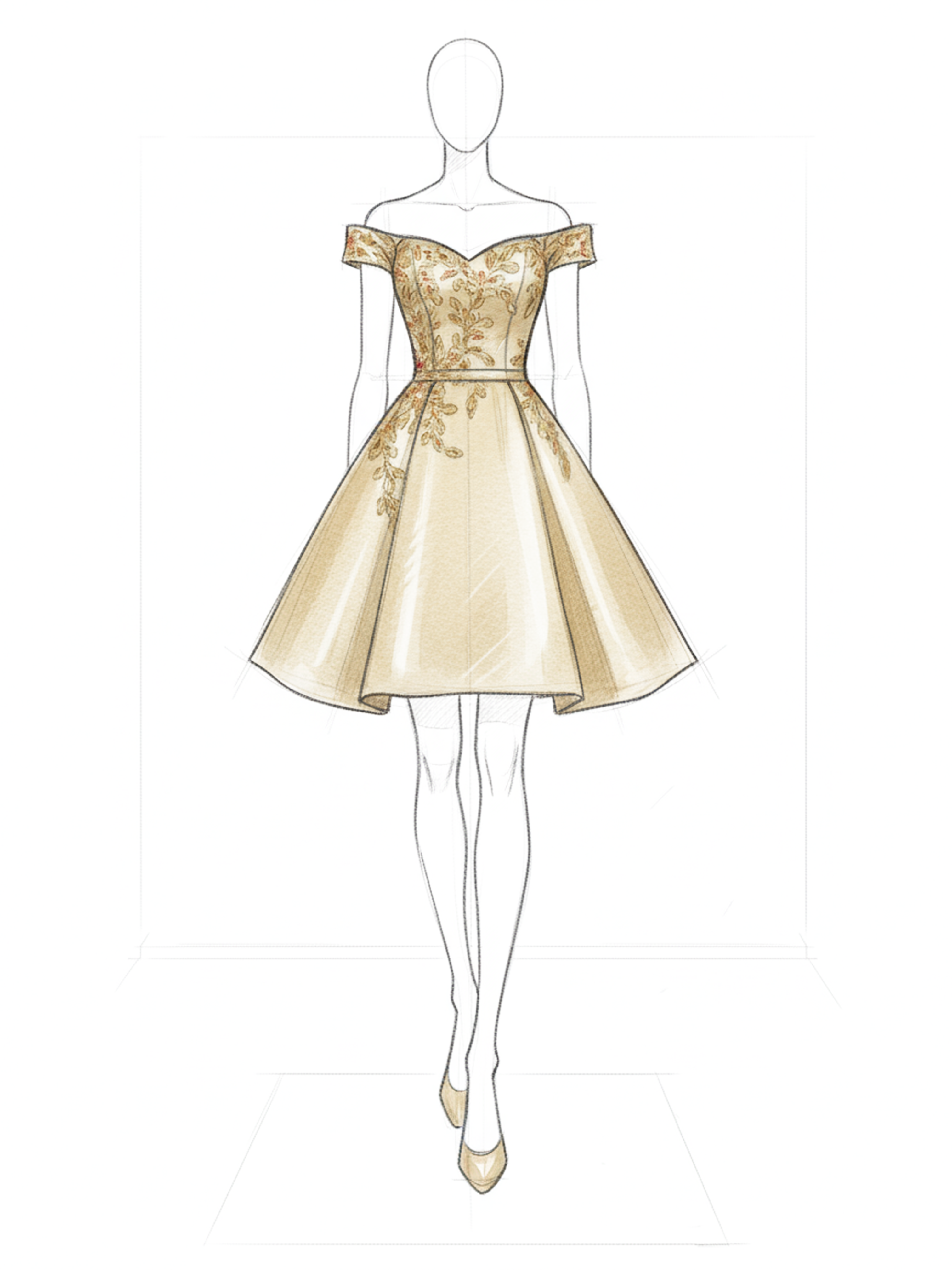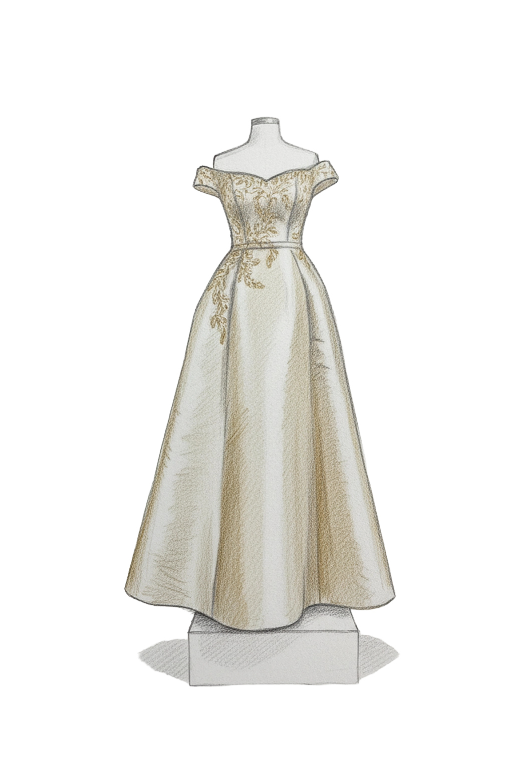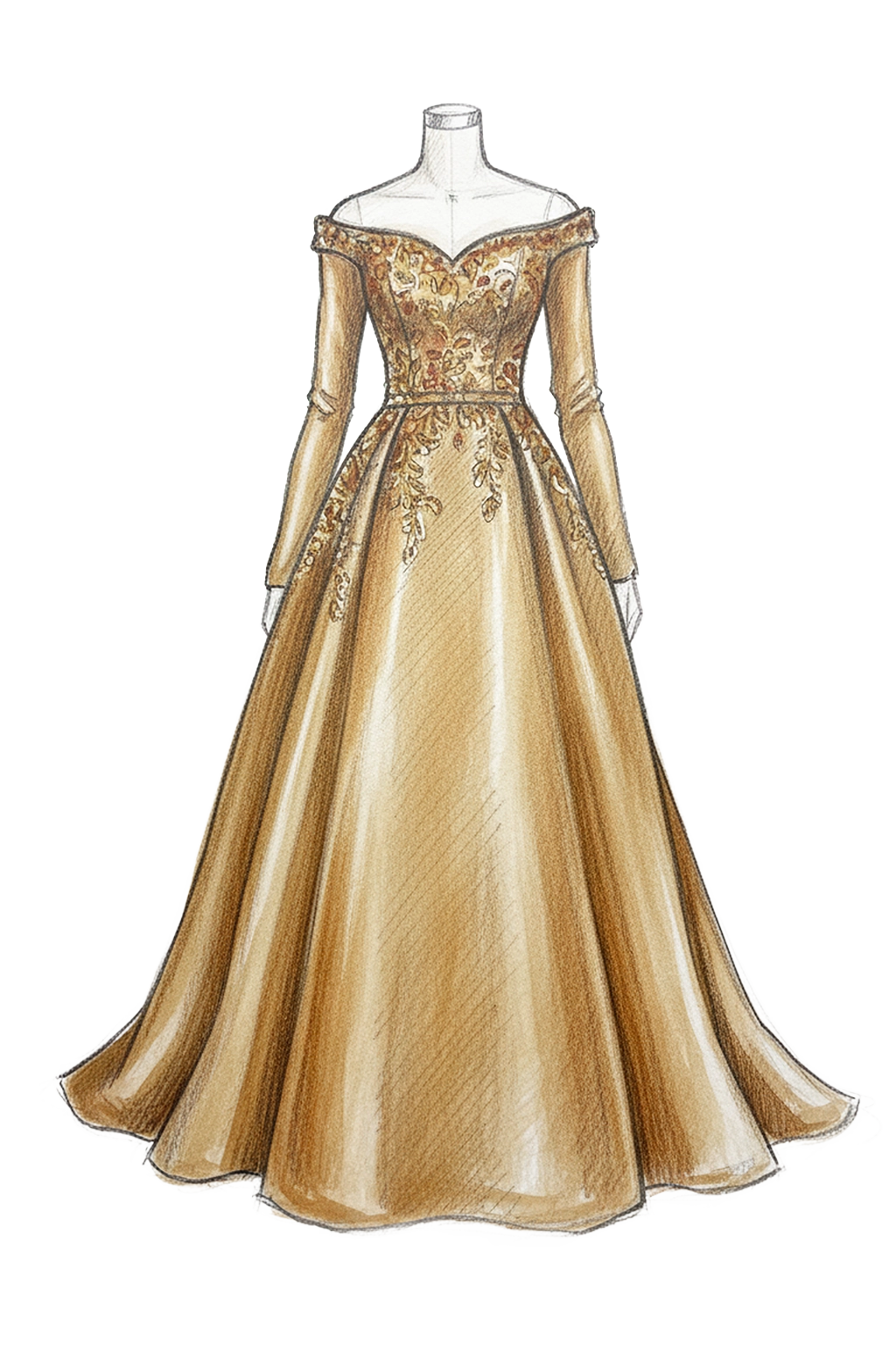 “Bu tasarımda altının asaleti ile kusursuz kalıbın gücünü buluşturmak istedim. Omuzdan dökülen zarif çiçek işlemeleri, klasik bir silueti güncel bir ifadeyle yeniden yorumluyor. Parlak yüzeyli kumaş, her adımda ışığı tutarak elbiseye ihtişamlı bir akış kazandırıyor. Amacım; hem zamansız hem de etkileyici bir duruş yaratmaktı.”