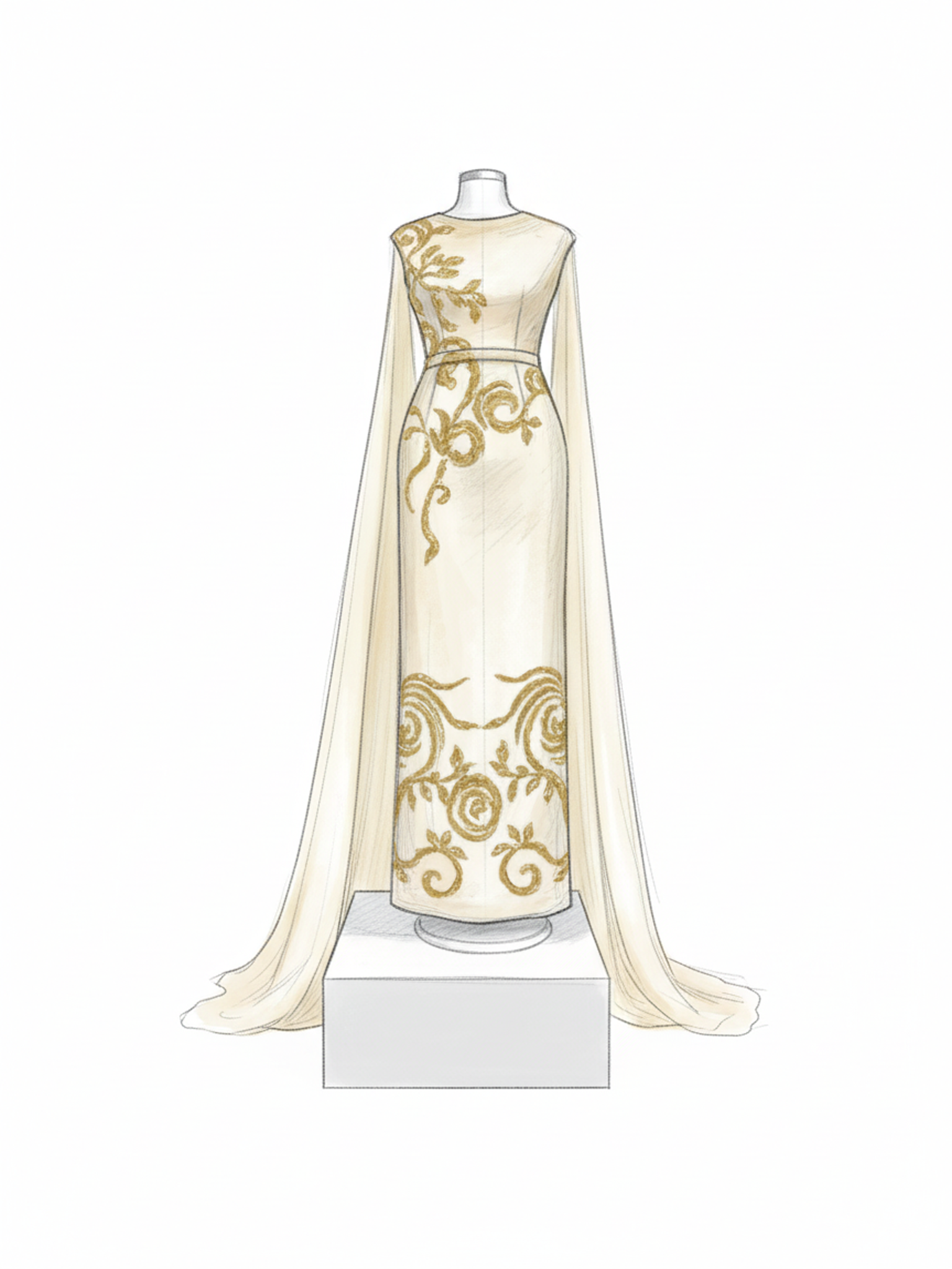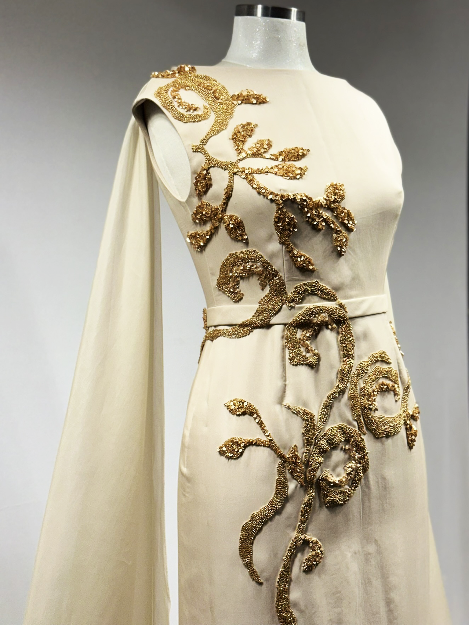 Altın işlemelerle vurgulanan tek omuz detayı, akışkan tül form üzerinde zamansız ve asil bir etki yaratır.
