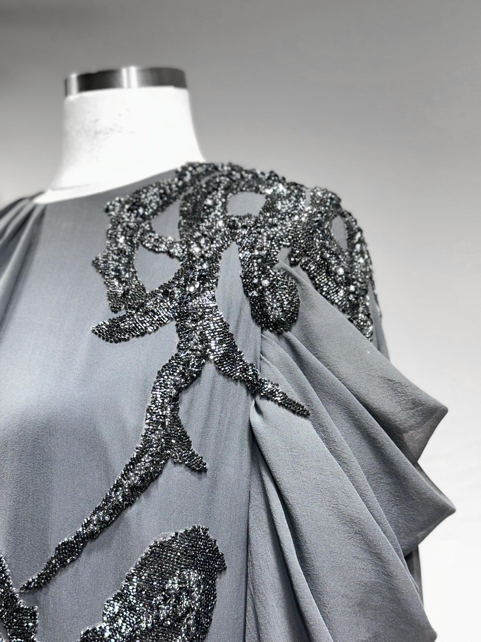Akışkan kumaş ve asimetrik drape, tek omuzdan yükselen zarif işlemeyle birleşerek güçlü ve sade bir duruş yaratır.