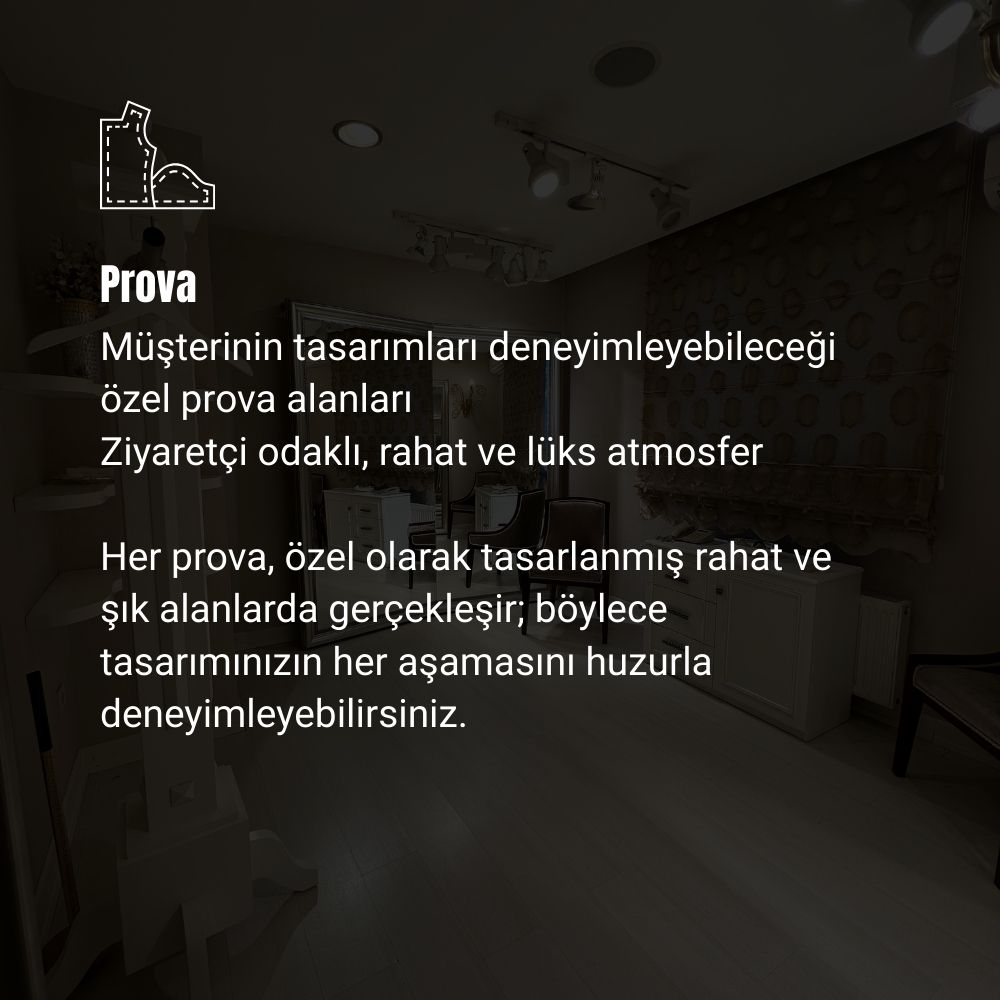 - Genellikle tasarımın karmaşıklığına ve detaylara göre 2 prova planlanır. İlk provada kalıp ve ölçü kontrolü yapılır, sonraki provada kumaş, dantel, işleme ve son dokunuşlar şekillenir. Her adımda sizin onayınız alınır; amaç, elbisenizin hem kusursuz oturması hem de sizi en zarif hâlinizle yansıtmasıdır.