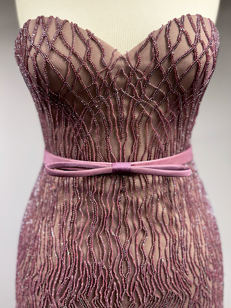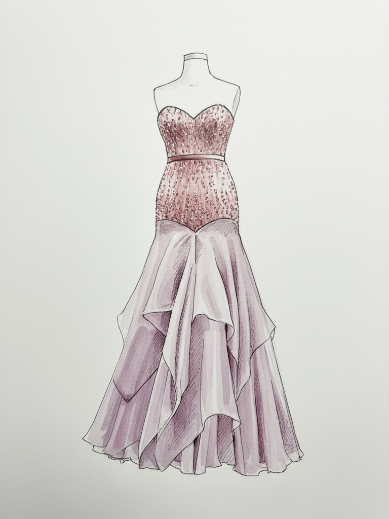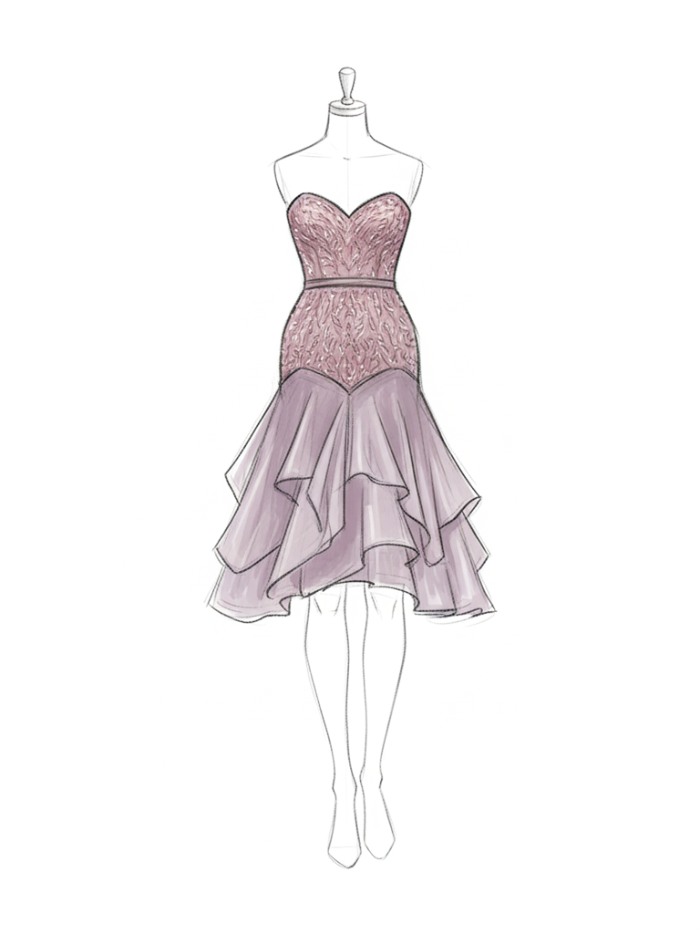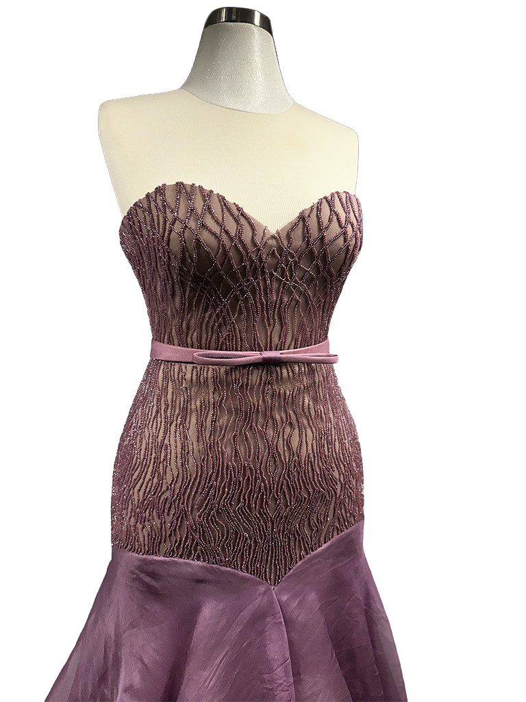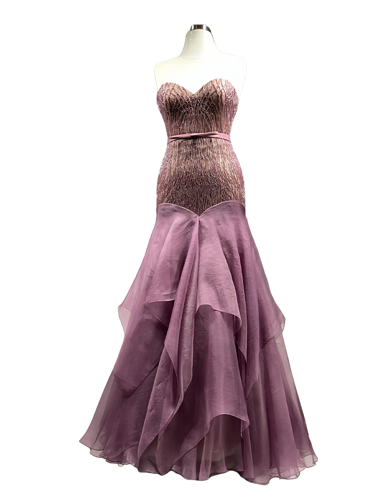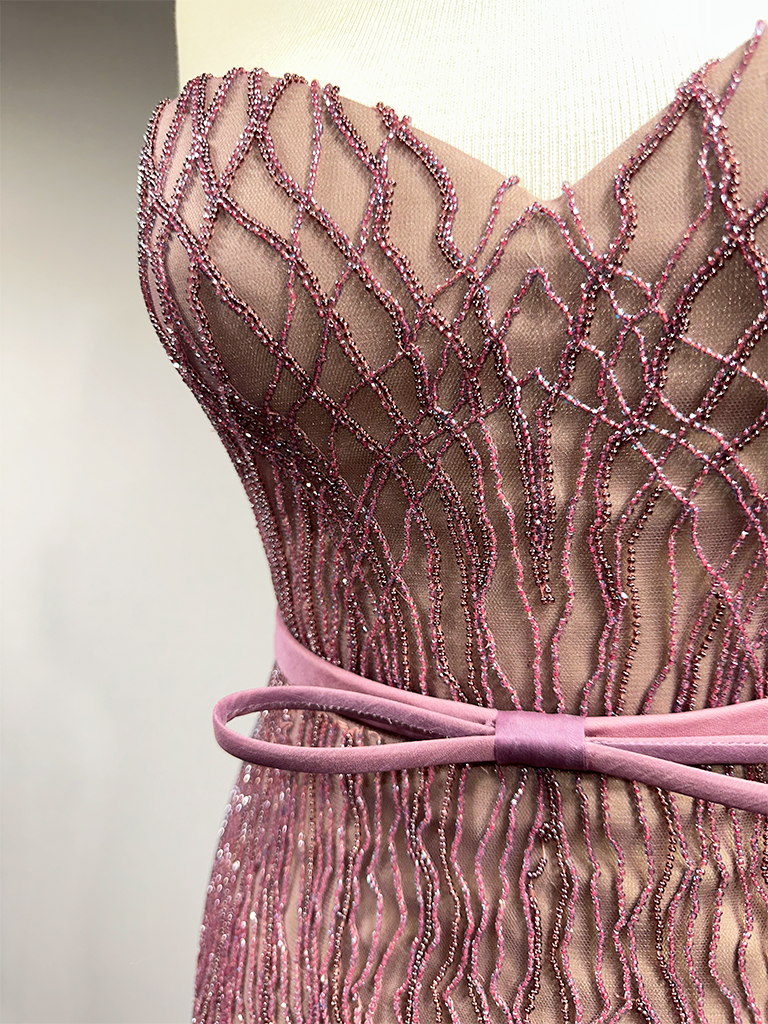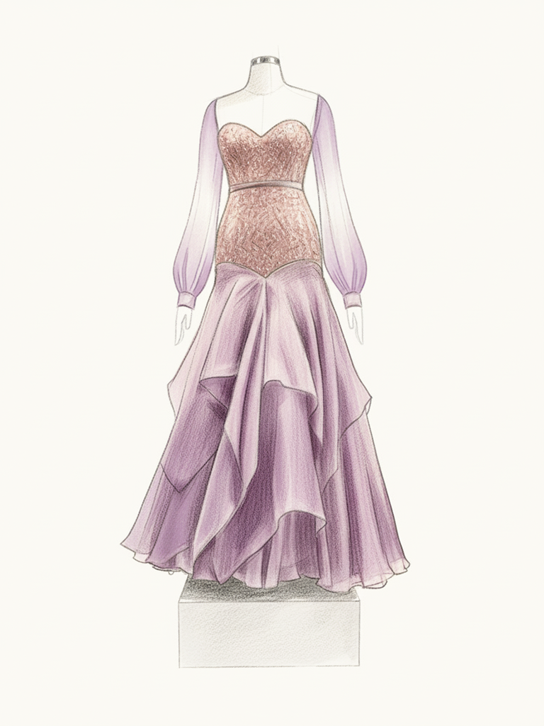 “Bu tasarımda morun derin romantizmini, heykelsi bir form ile buluşturmak istedim. Gövdedeki ince dokulu işlemeler, ışığın yüzeyde gezinen izlerini hatırlatırken; katmanlı etek, yumuşak bir rüzgârla hareket eden tül bulutlarını andırıyor. Siluet hem duyusal hem de sofistike bir akış yaratacak şekilde tasarlandı.”
