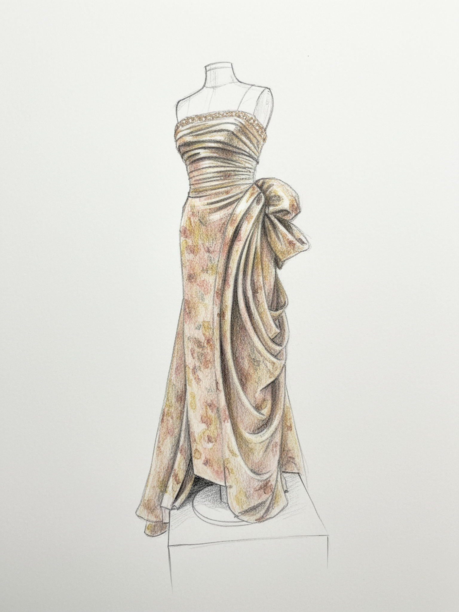 Işıltılı drapeler ve beldeki heykelsi fiyonk, kumaşın akışını vurgulayarak feminen ve sofistike bir siluet oluşturur.