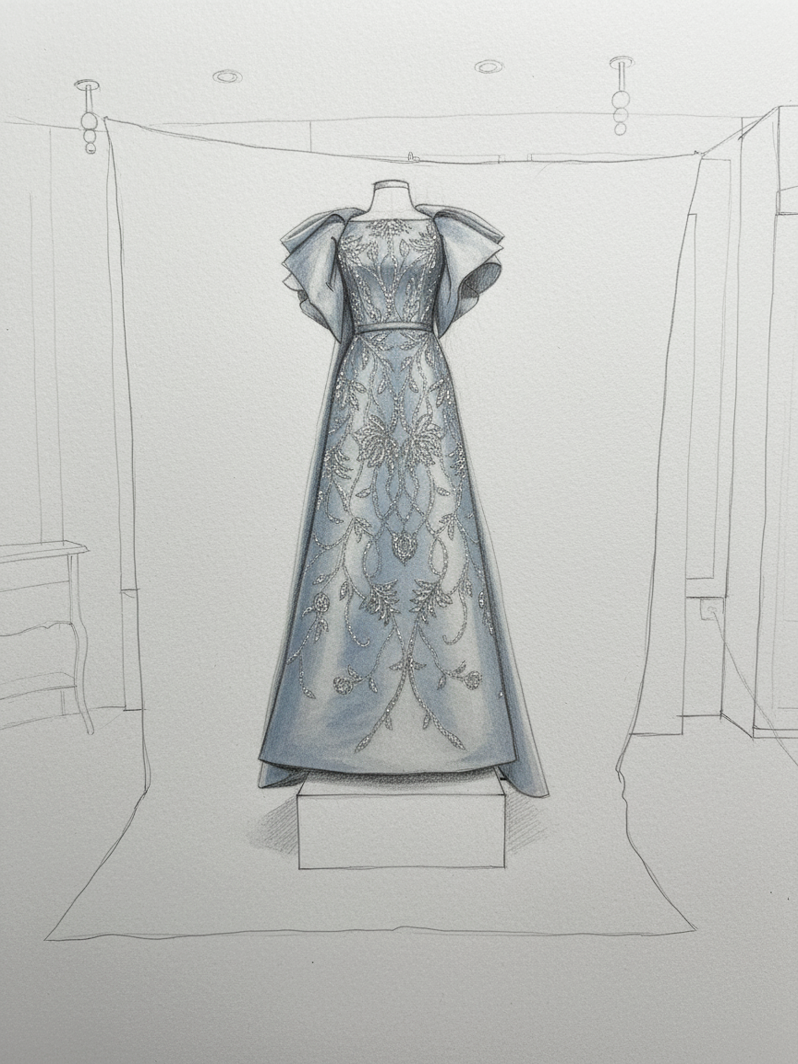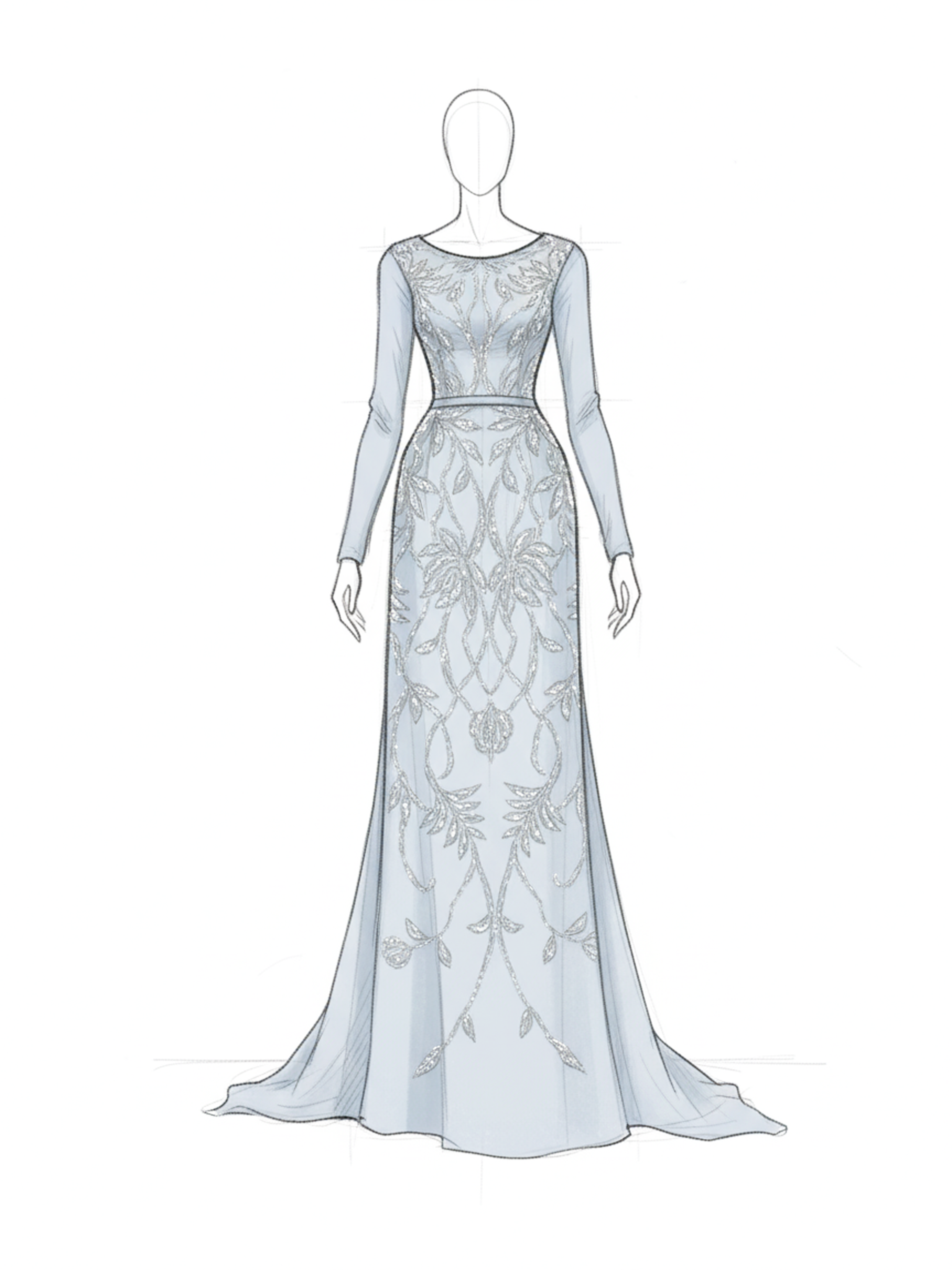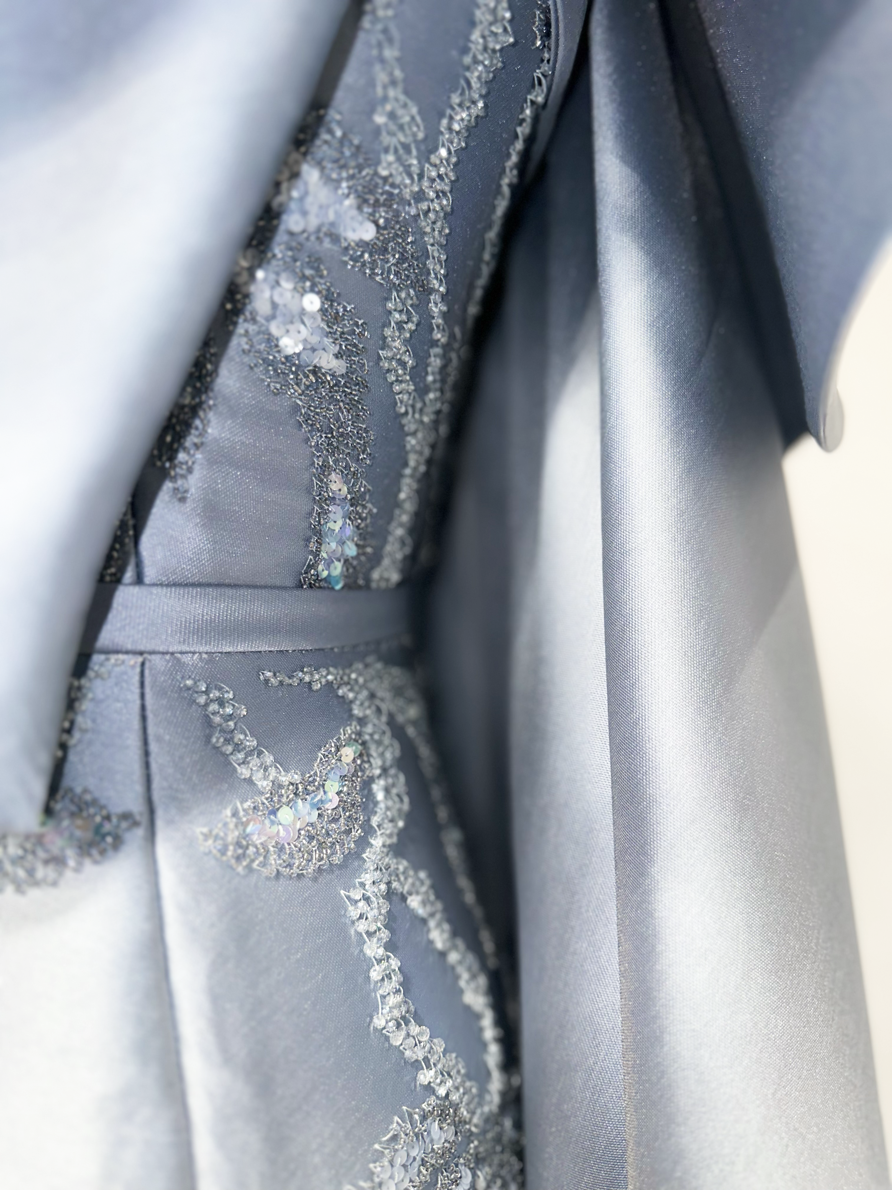 “Bu tasarımda dingin bir gücü görünür kılmak istedim. Buz mavisinin sessiz asaleti, heykelsi omuzlarla birleşerek modern bir siluet yaratıyor. İnce gümüş işlemeler, donmuş bir dalın üzerinde parlayan ışık gibi yüzeyde akıyor. Amaç; hem masalsı hem de kusursuz bir duruşa sahip bir zarafet yaratmaktı.”