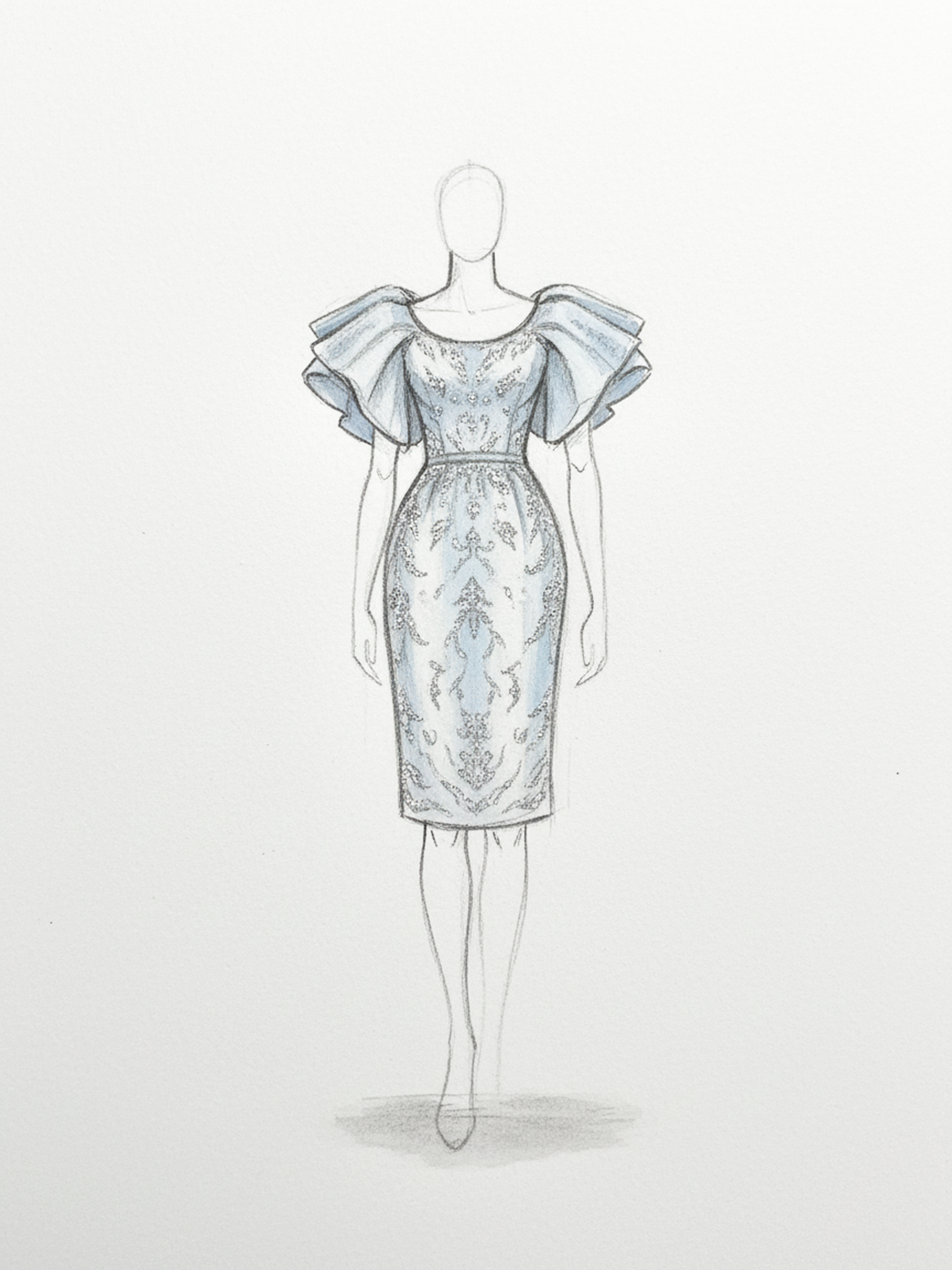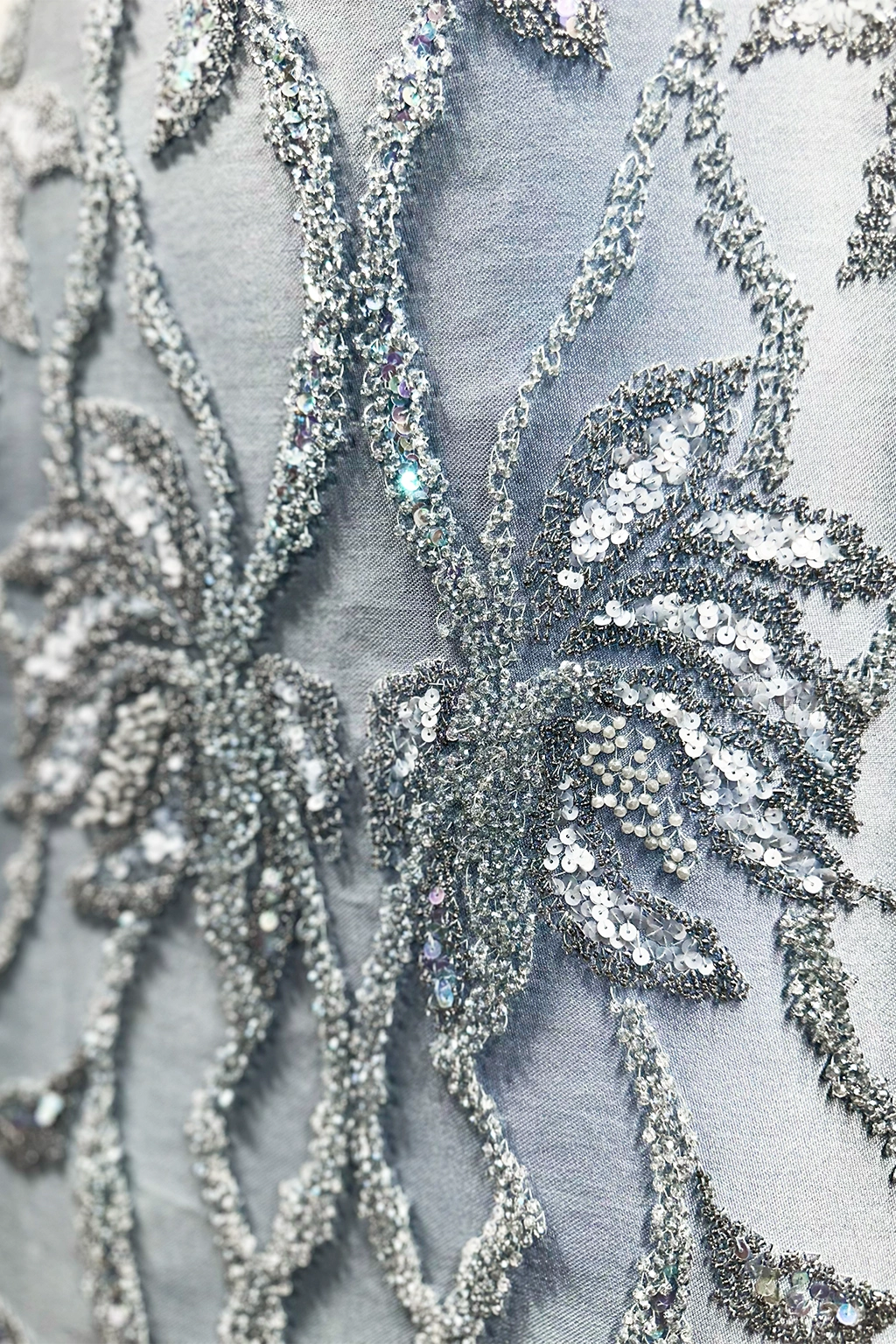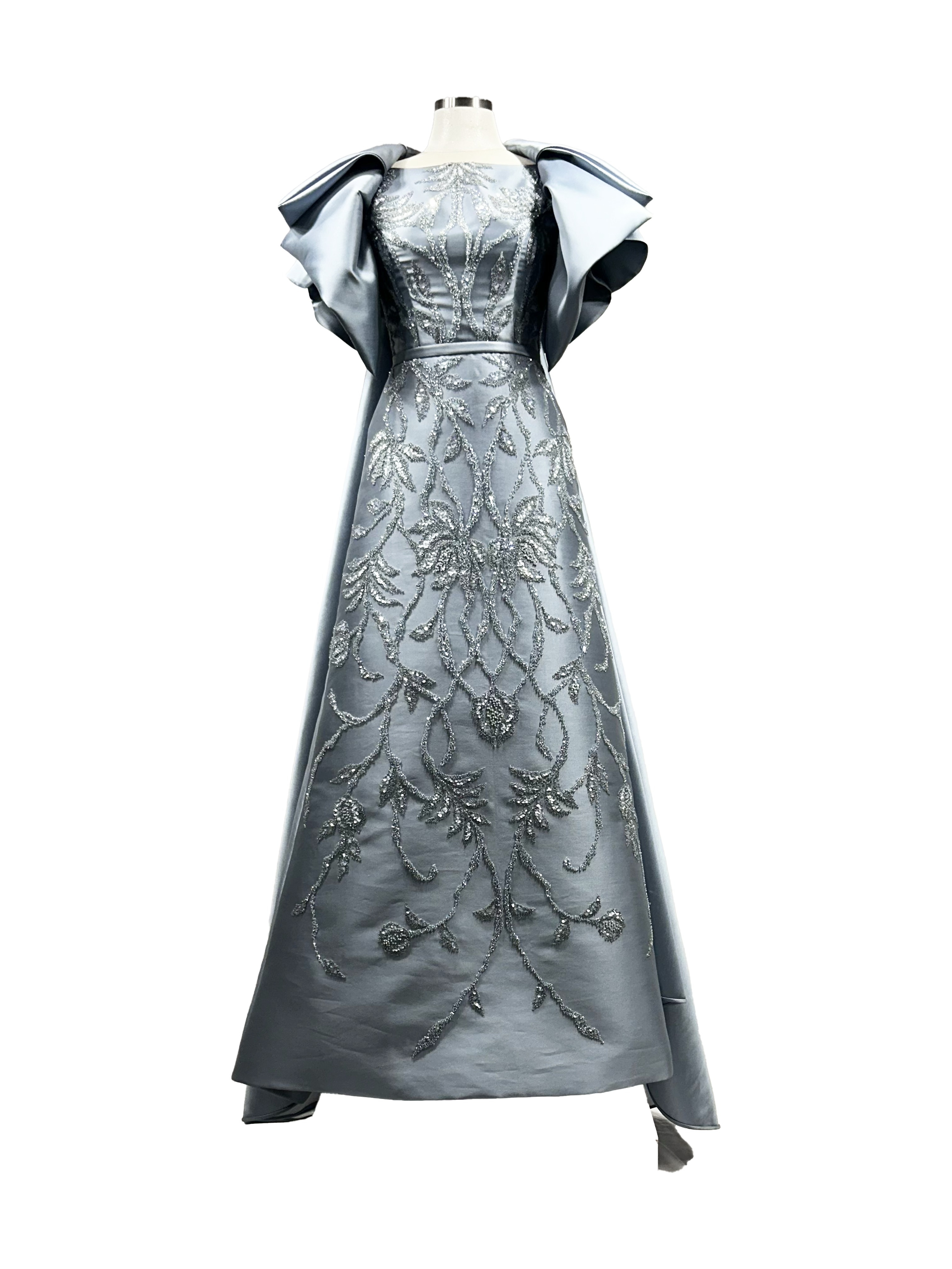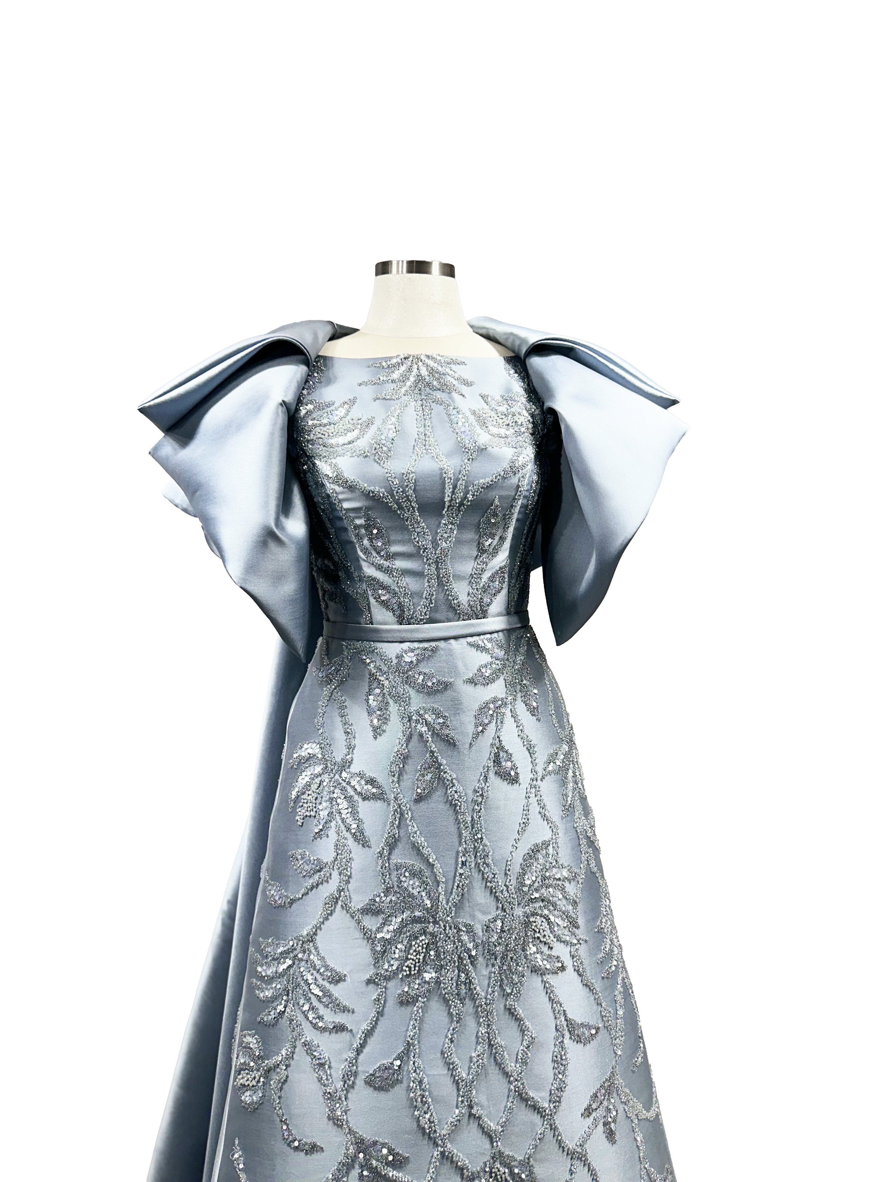 “Bu tasarımda dingin bir gücü görünür kılmak istedim. Buz mavisinin sessiz asaleti, heykelsi omuzlarla birleşerek modern bir siluet yaratıyor. İnce gümüş işlemeler, donmuş bir dalın üzerinde parlayan ışık gibi yüzeyde akıyor. Amaç; hem masalsı hem de kusursuz bir duruşa sahip bir zarafet yaratmaktı.”