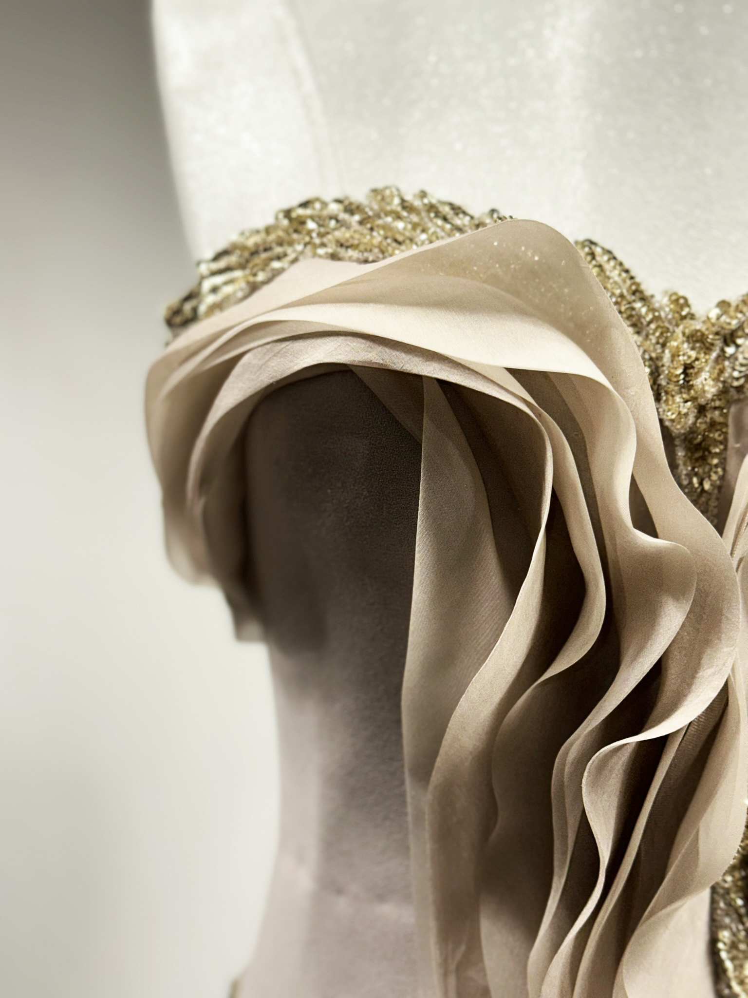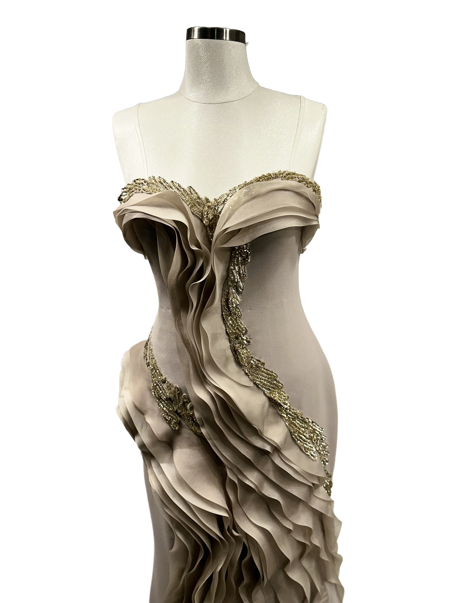 Heykelsi drapeler ve zarif işlemeler, bedeni saran formda akışkan ve sofistike bir etki yaratır.
